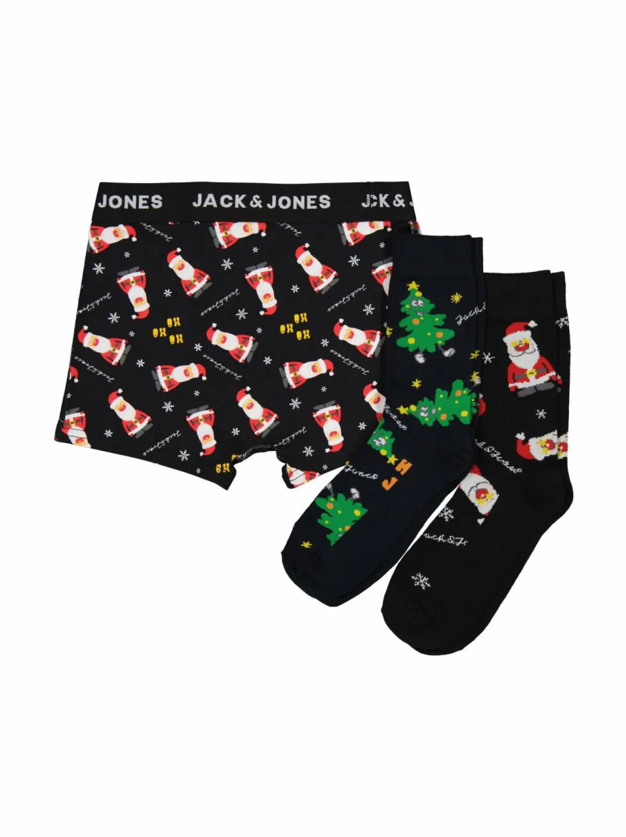 Jack & Jones Jachohoho -lahjasetti tuo hauskaa joulutunnelmaa lapsesi vaatekaappiin. Setissä on jouluaiheiset bokserit ja kahdet erilaiset sukat, jotka on koristeltu iloisilla kuoseilla, kuten joulupukilla ja joulukuusilla. Pehmeä puuvillasekoite ja elastaani varmistavat mukavan joustavuuden ja ihanan tuntuman ihoa vasten.