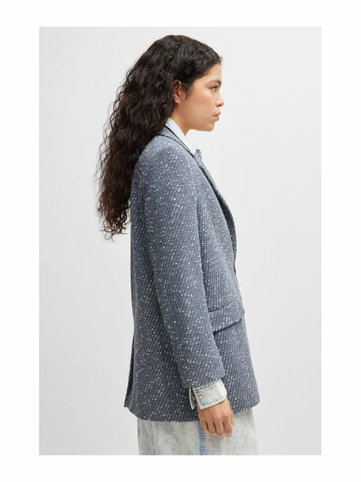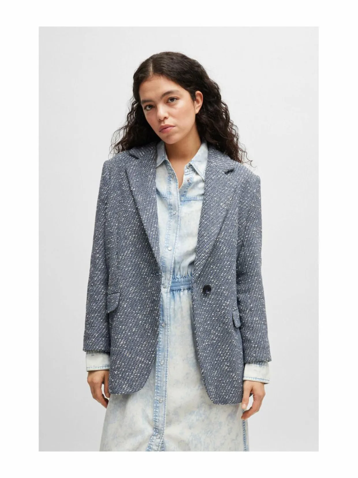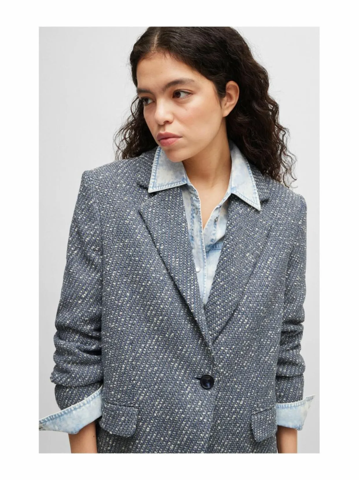 Bossin Jasoina-bleiseri on valmistettu vivahteikkaasta denim tweed -kankaasta, jossa on uniikki tekstuuri. Jakku kiinnitetään napilla ja siinä on läpälliset käsitaskut ja käännettävä lovikaulus. Jos haluat luoda astetta casualimman ilmeen, voit kääriä hihat. Takki on kokonaan vuorattu. 62 % kierrätysmateriaalia.