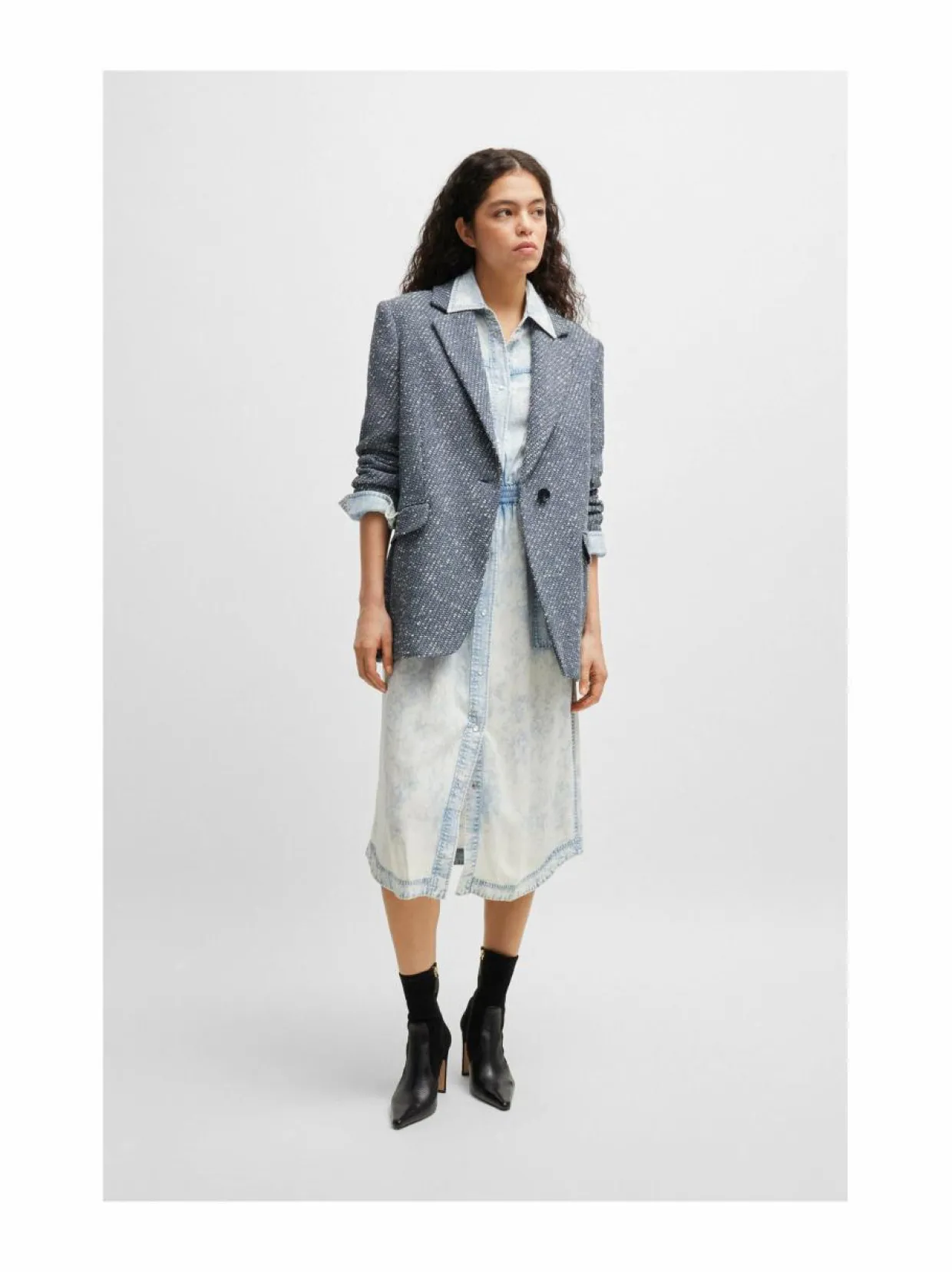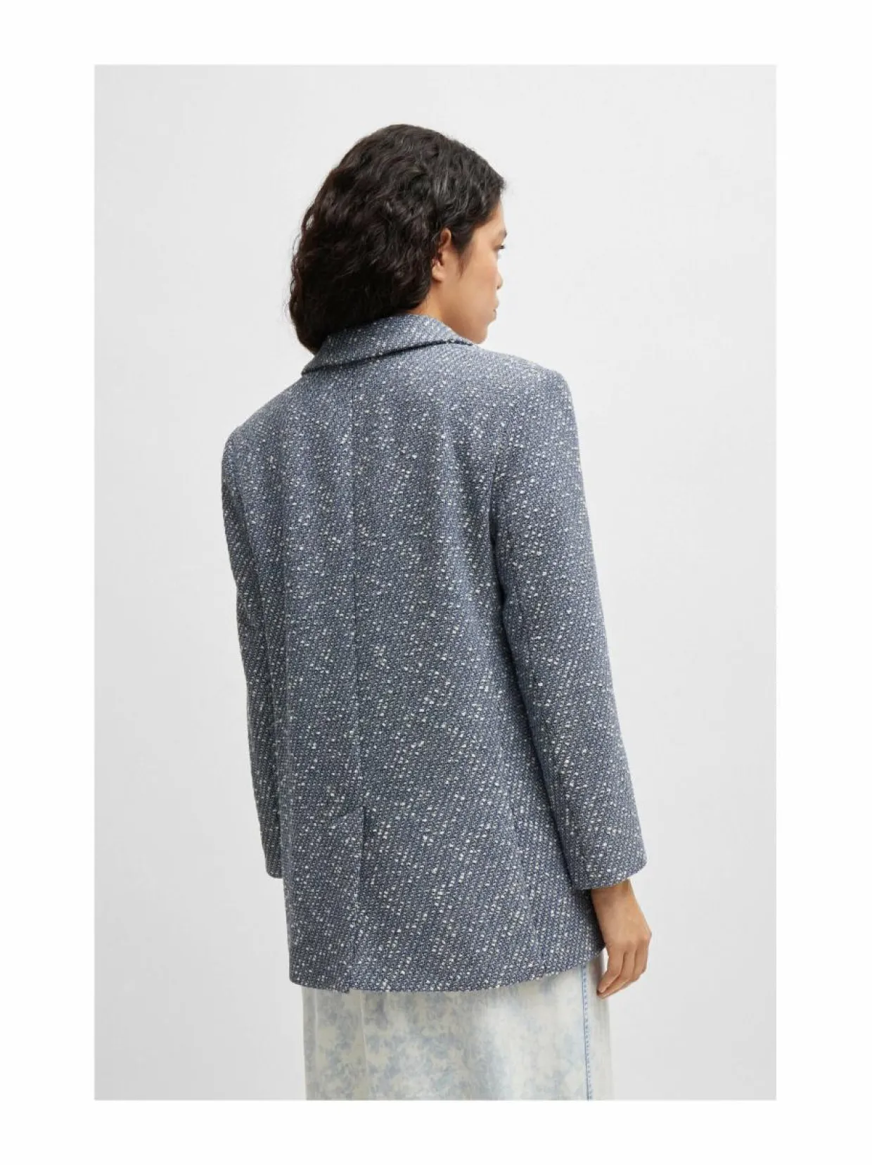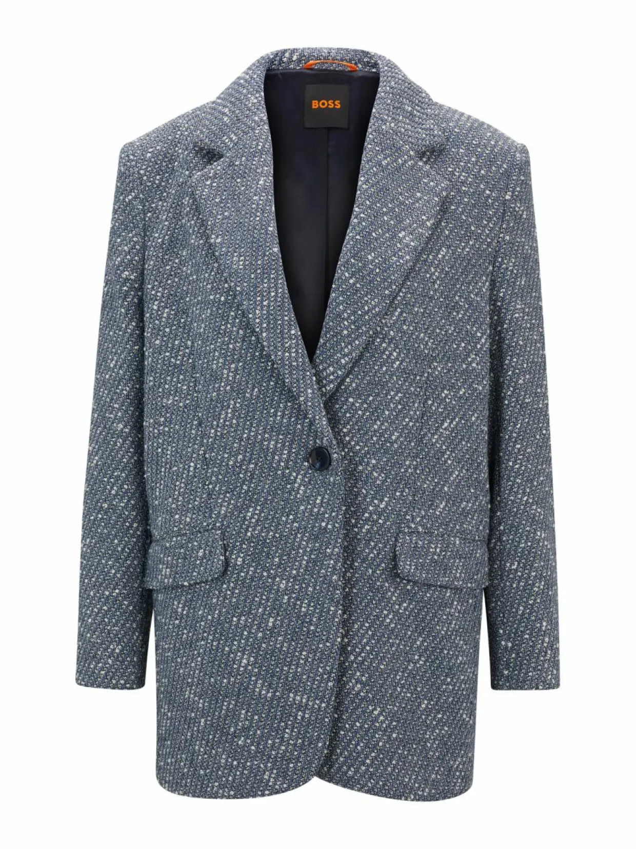Bossin Jasoina-bleiseri on valmistettu vivahteikkaasta denim tweed -kankaasta, jossa on uniikki tekstuuri. Jakku kiinnitetään napilla ja siinä on läpälliset käsitaskut ja käännettävä lovikaulus. Jos haluat luoda astetta casualimman ilmeen, voit kääriä hihat. Takki on kokonaan vuorattu. 62 % kierrätysmateriaalia.