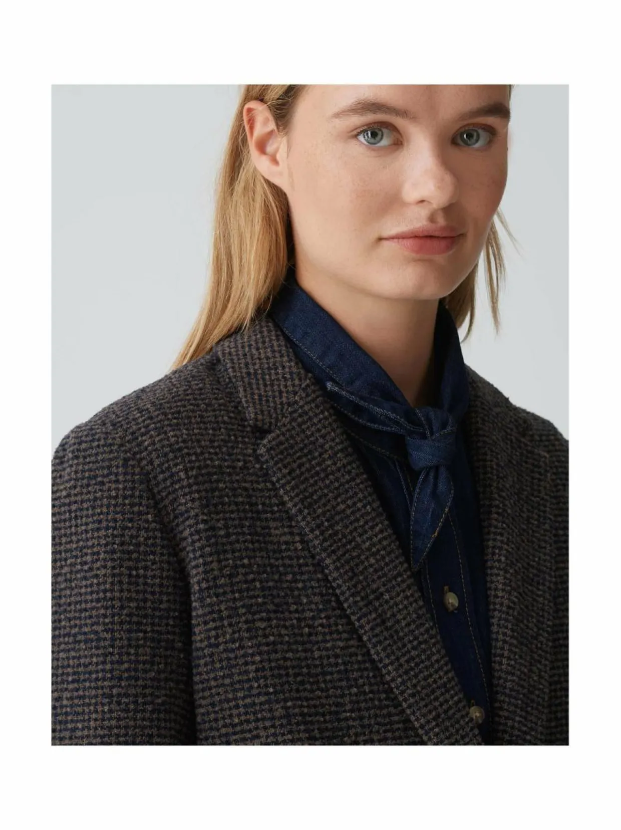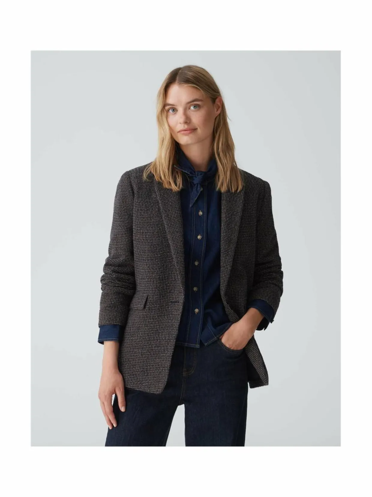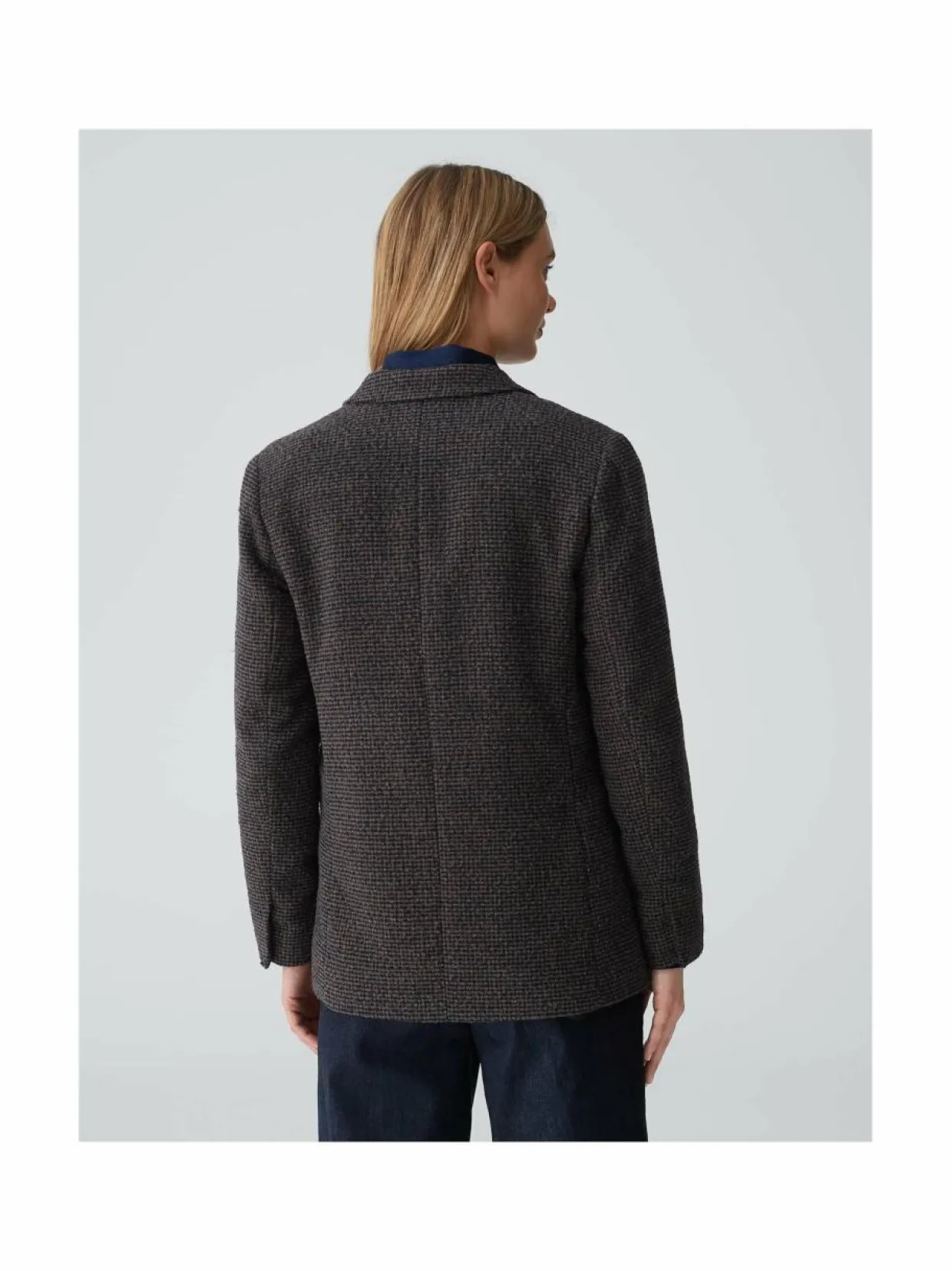 Klassinen yksirivinen bleiseri harjatulla ulkopinnalla. Sisäpuolella sileä satiinivuoraus. Materiaaliin on lisätty myös lämmittävää villaa. Yksityiskohdat: