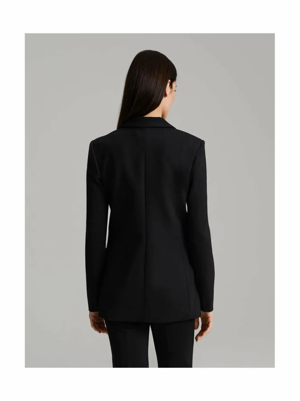 Andiatan Jenner-bleiserissä on lovikaulus ja näyttävä kaksirivinen napitus. Bleiserin vartalo-osa on vuoritettu sileäpintaisella kankaalla.