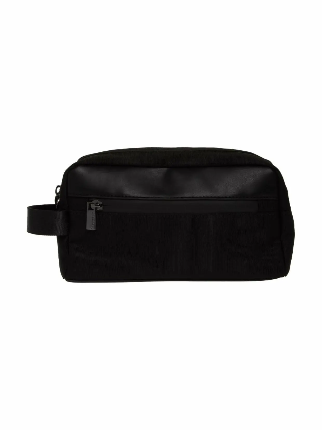 Keinonahkaa ja tekstiiliä yhdistelevä CONSTRUE-toilettilaukku on hyvä ottaa vaikka matkalle mukaan. Laukku on jaettu kahteen vetoketjulla suljettavaa osioon, joista toisessa on vielä avotasku. Laukun voi ripustaa kätevästi naulakkoon roikkumaan.