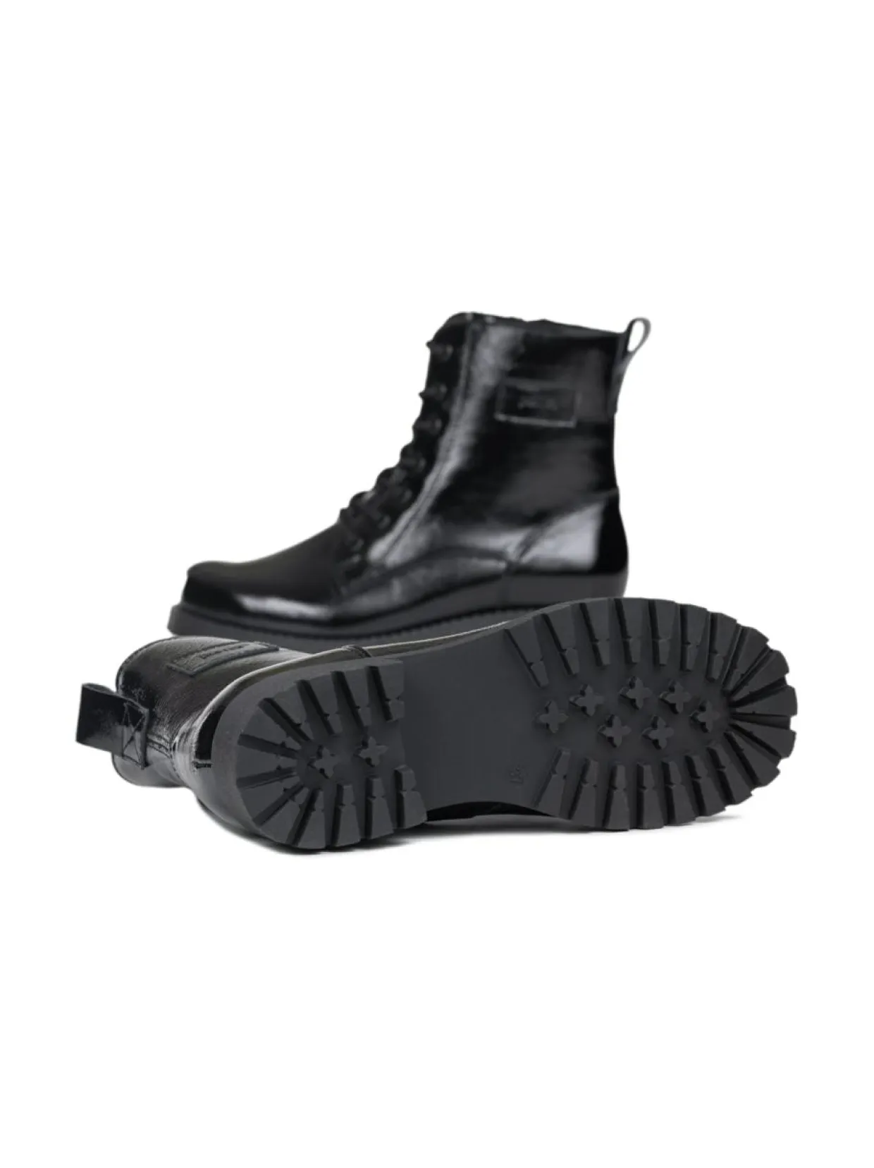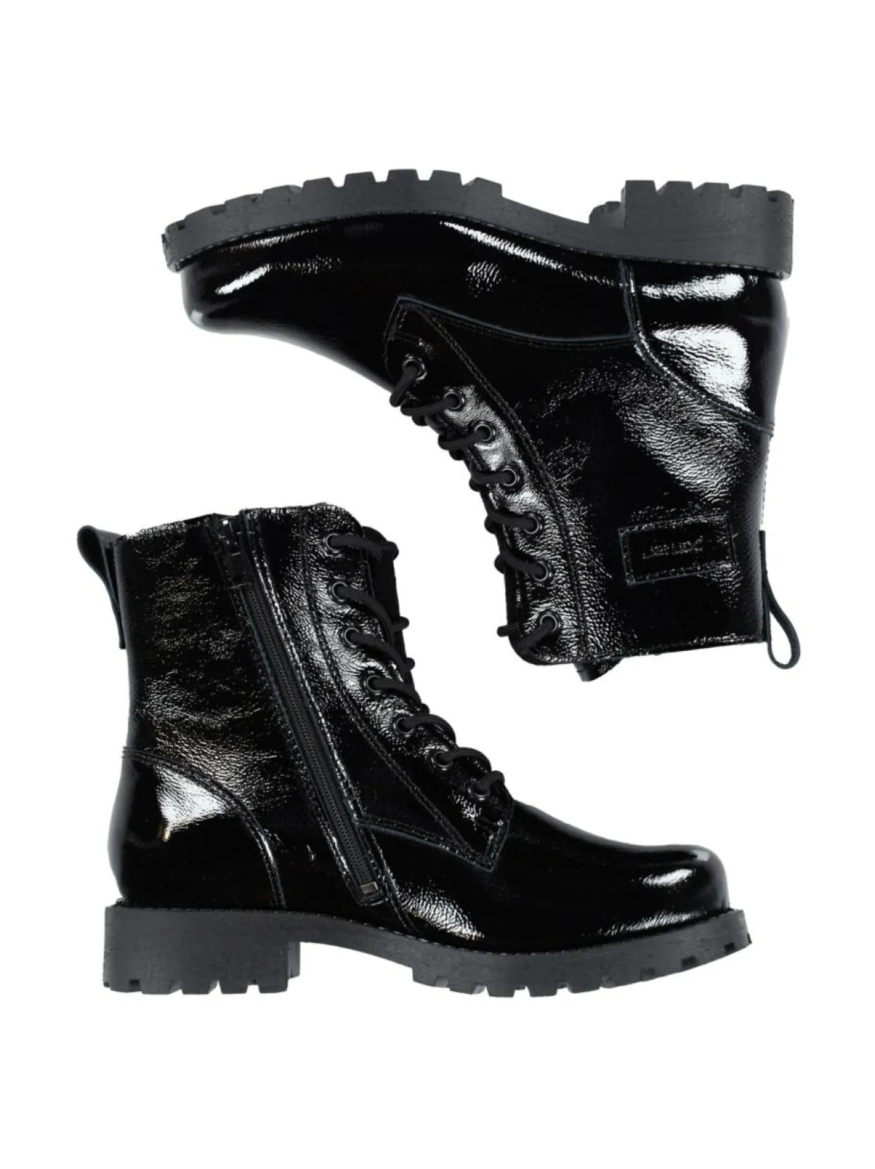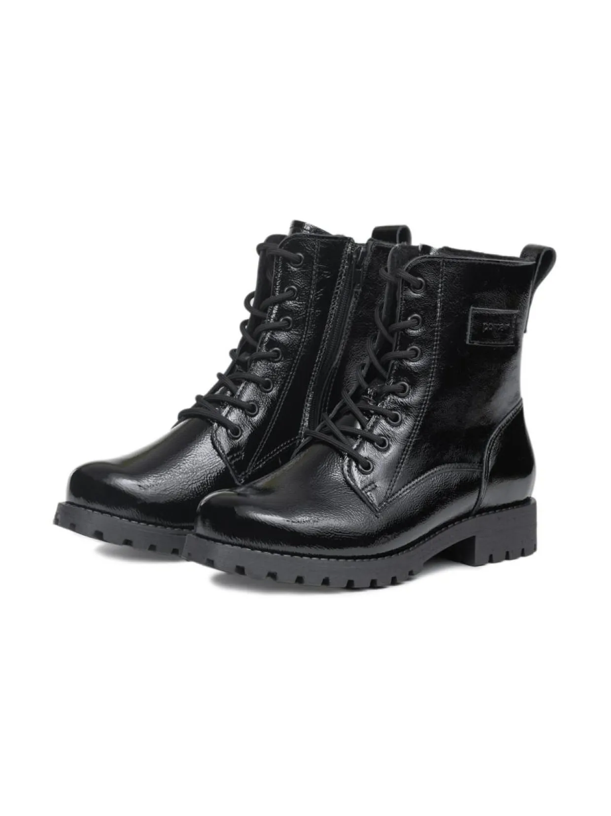 Päällismateriaali mustaa, kiiltävää, eläväpintaista lakerinahkaa.