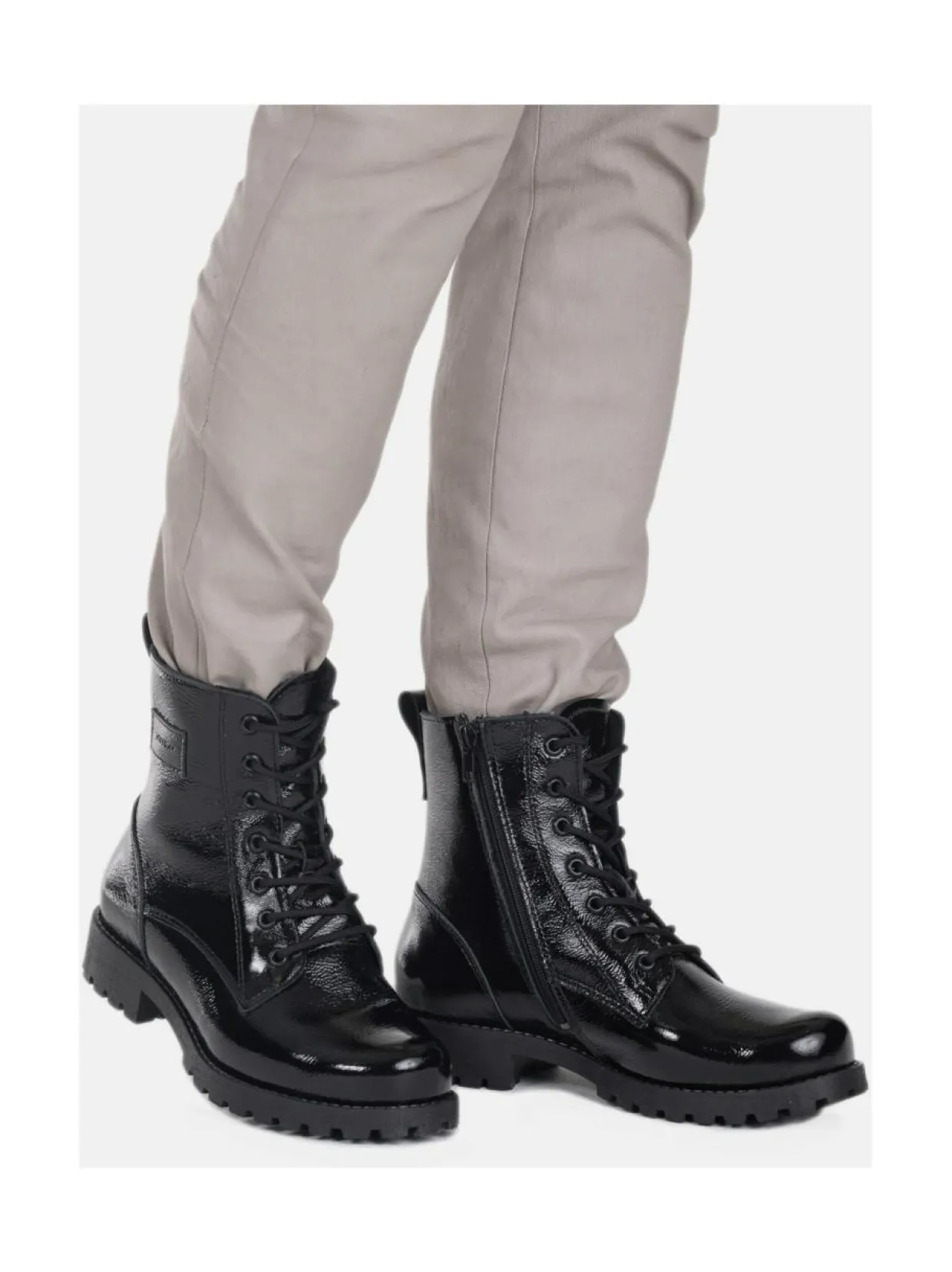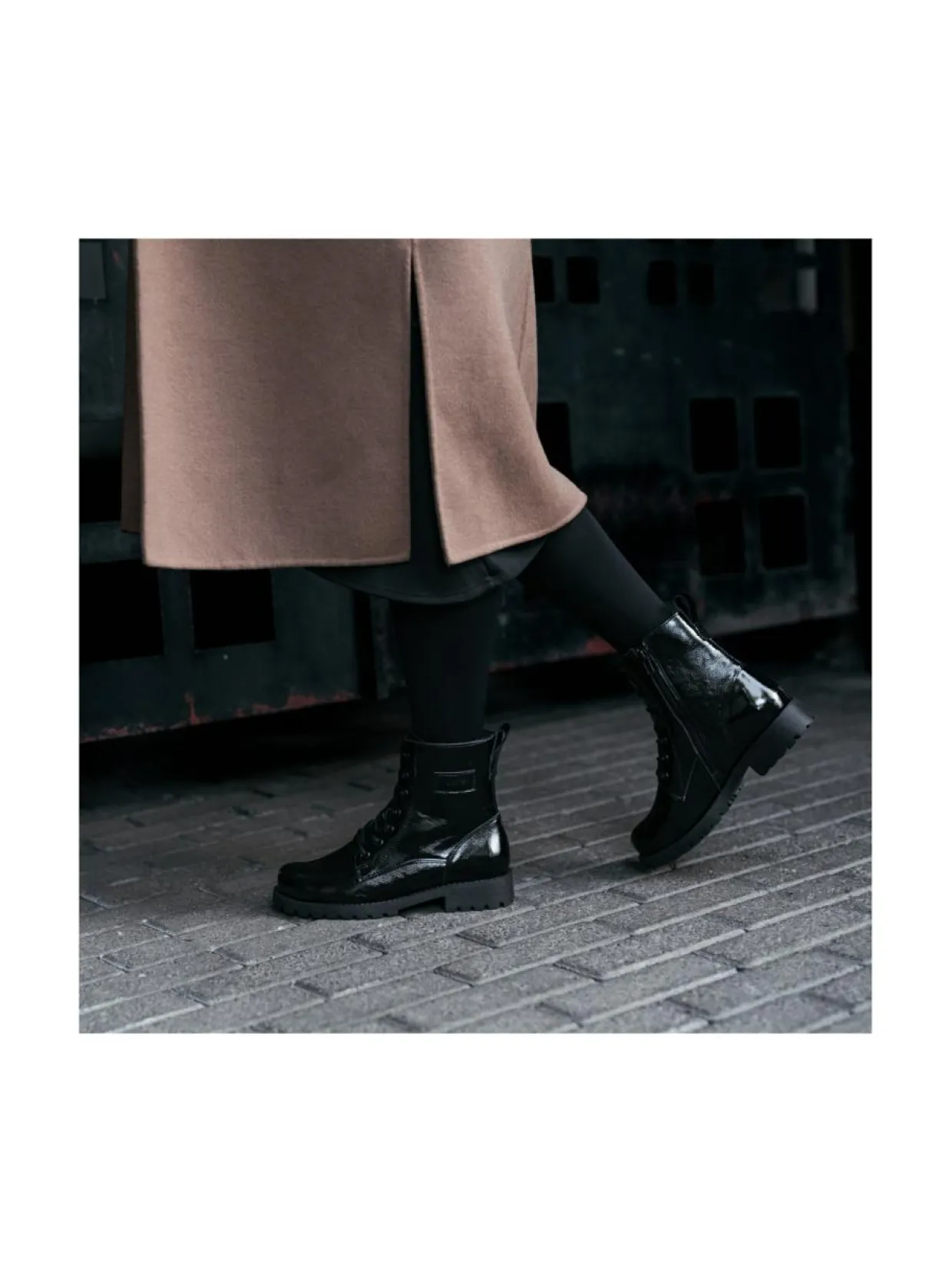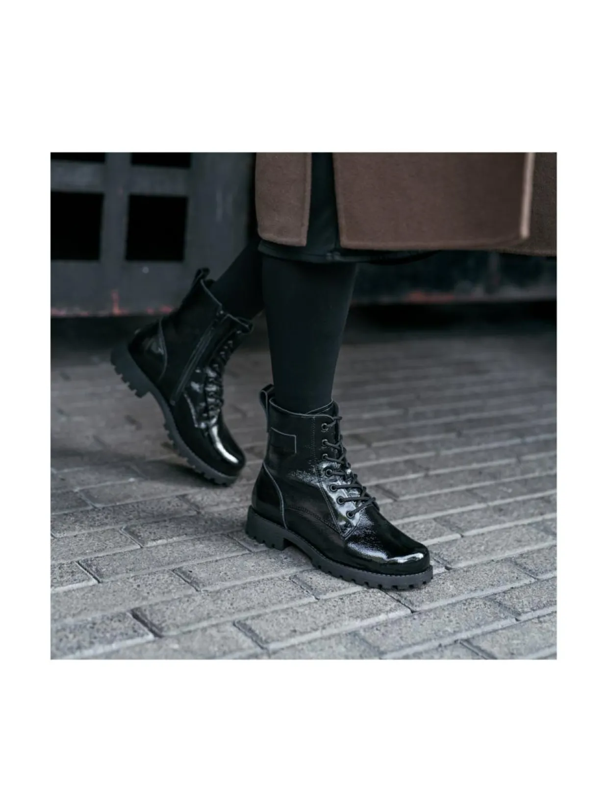 Päällismateriaali mustaa, kiiltävää, eläväpintaista lakerinahkaa.