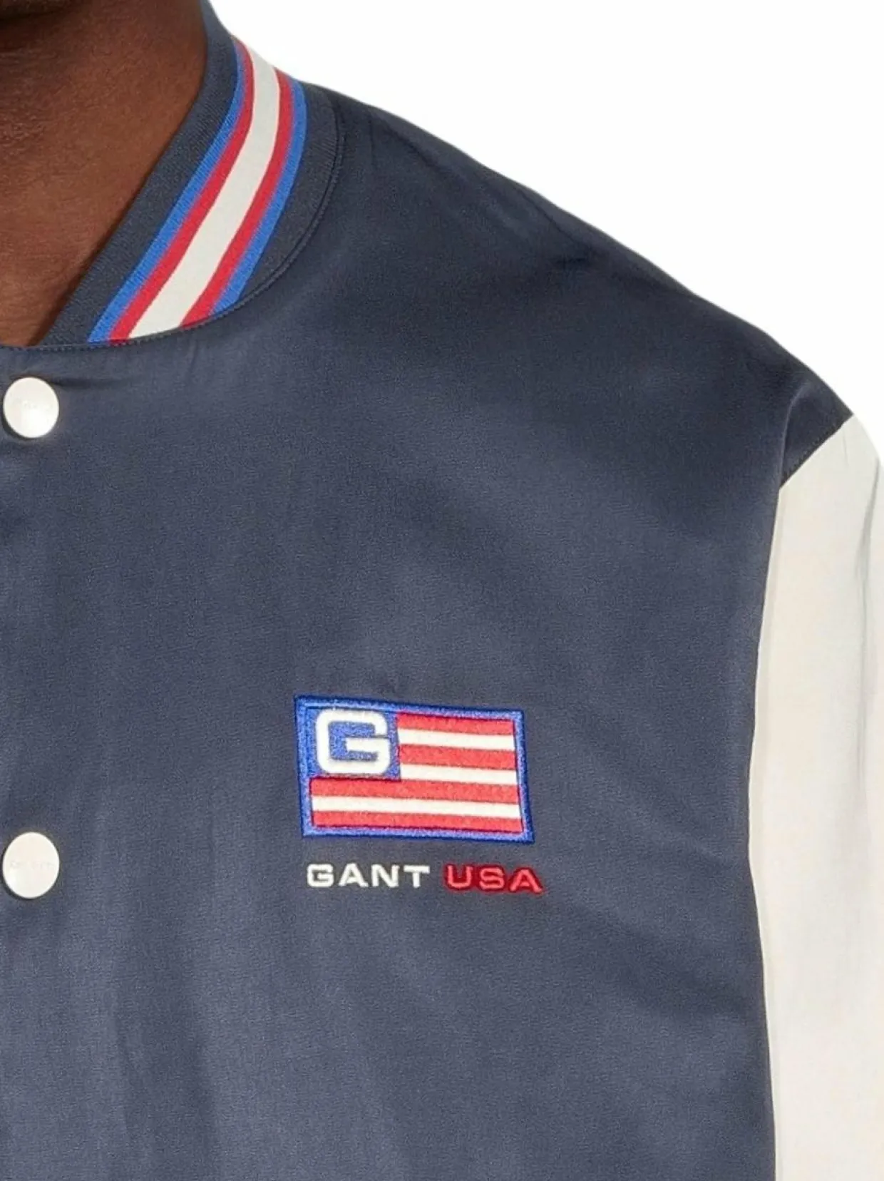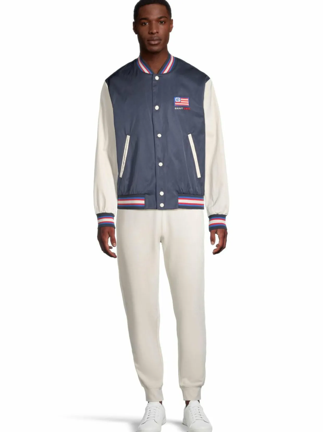 Gantin sporttinen varsity-takki on valmistettu kevyestä kierrätyspolyesterisekoitteesta ja siinä on vettähylkivä viimeistely. Takin retrohenkisiin yksityiskohtiin kuuluvat eriväriset osiot, pilottitakin kaulus, raidalliset resorit, painonapit sekä kirjailtu kuvio rinnassa ja selässä. Regular fit ‑mitoitettu takki päättyy hieman lantiolinjan yläpuolelle. Siinä on kokovuori, vetoketjukiinnitys, vinot sivutaskut ja lisäksi kaksi kätevää teretaskua sisäpuolella.