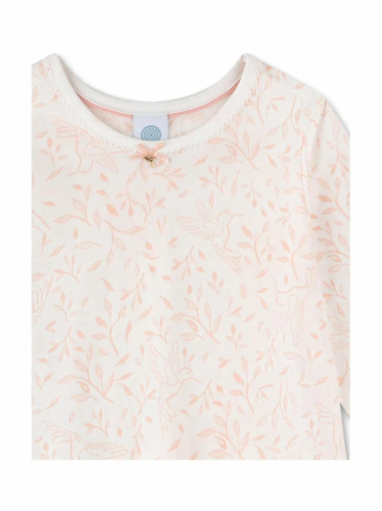 Sanettan Kids Bird Frill -pyjamapaita on puuvilla-modaalitrikoosta valmistettu paita nukkumiseen. Siinä on röyhelöreuna ja hento lintuprintti. Resorillista pääntietä täydentää rusetti ja pieni koru. Sivusaumassa on pieni logoetiketti.