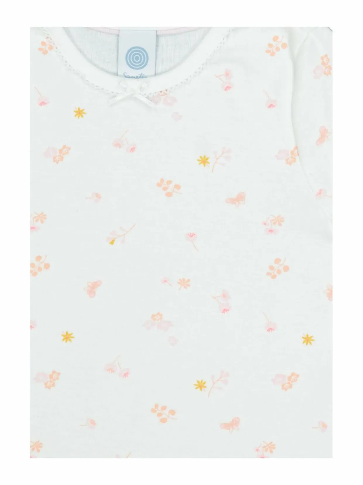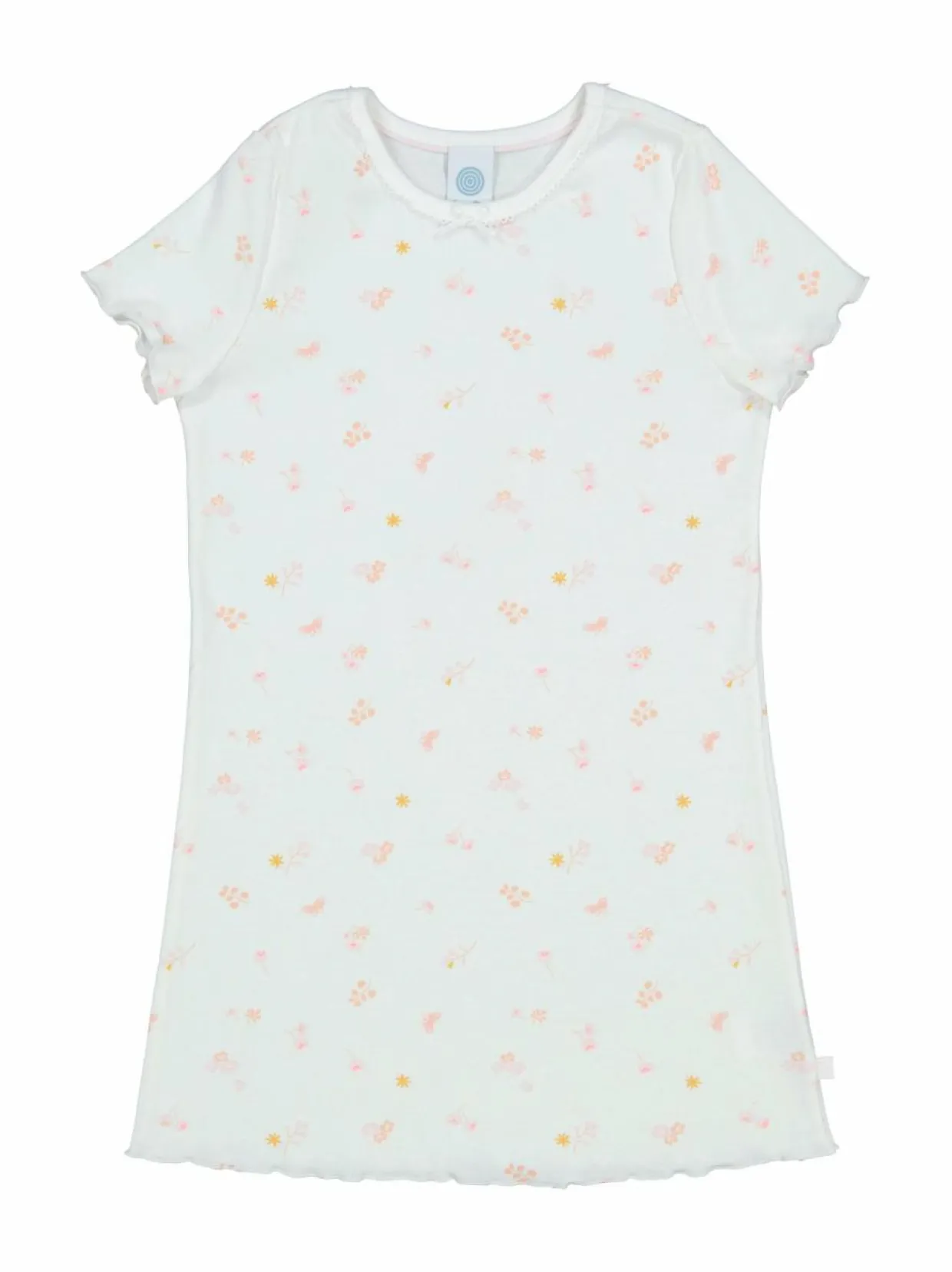 Lyhythihainen yöpaita hillityssä kukkakuosissa. Siinä on simpukkareunuksinen pyöreä pääntie, jonka keskipisteessä on pieni rusetti. Yöpaidan reunukset ovat kauniisti aaltoilevat. Materiaalina on käytetty ihoystävällistä puuvillaa.