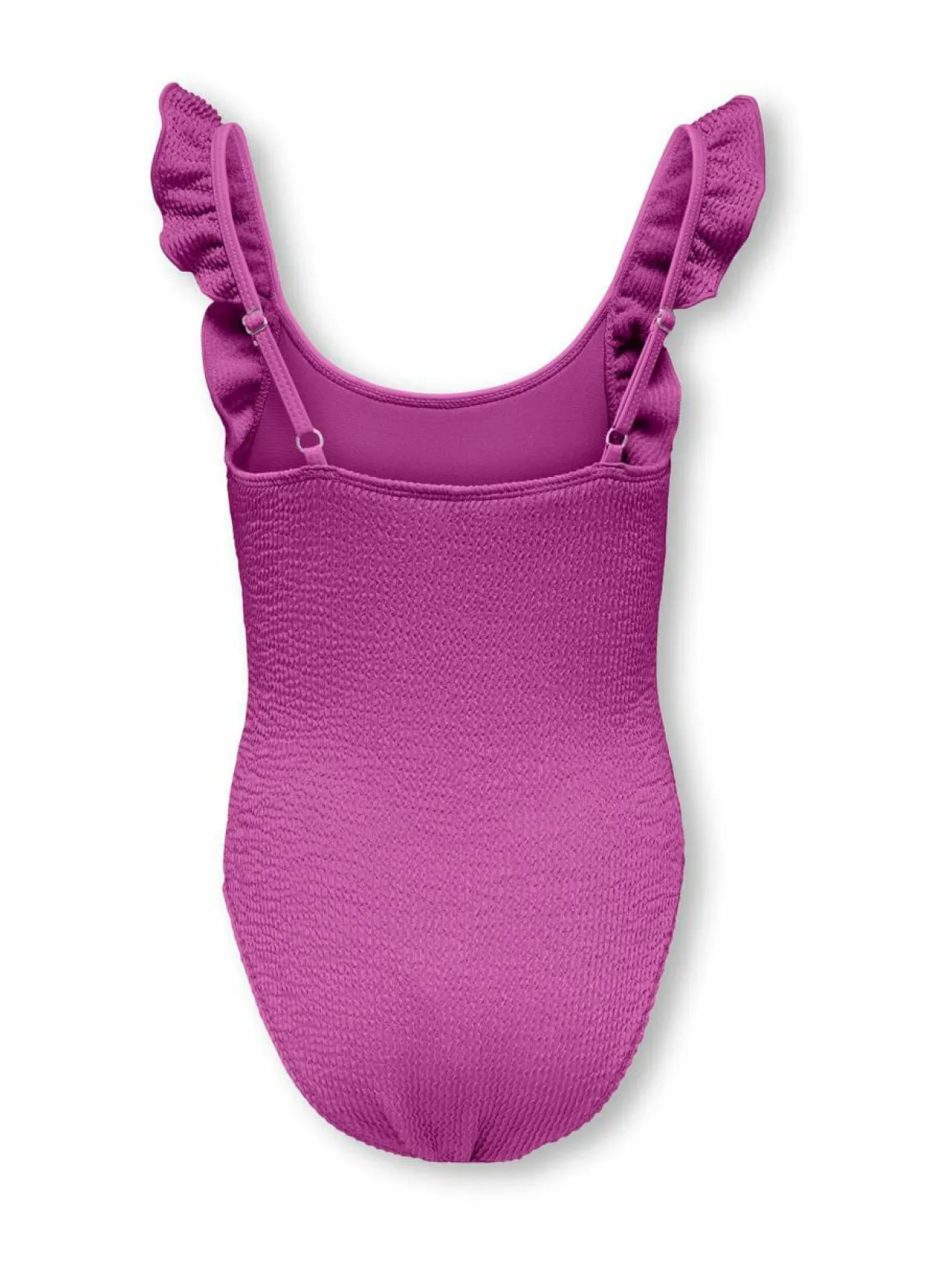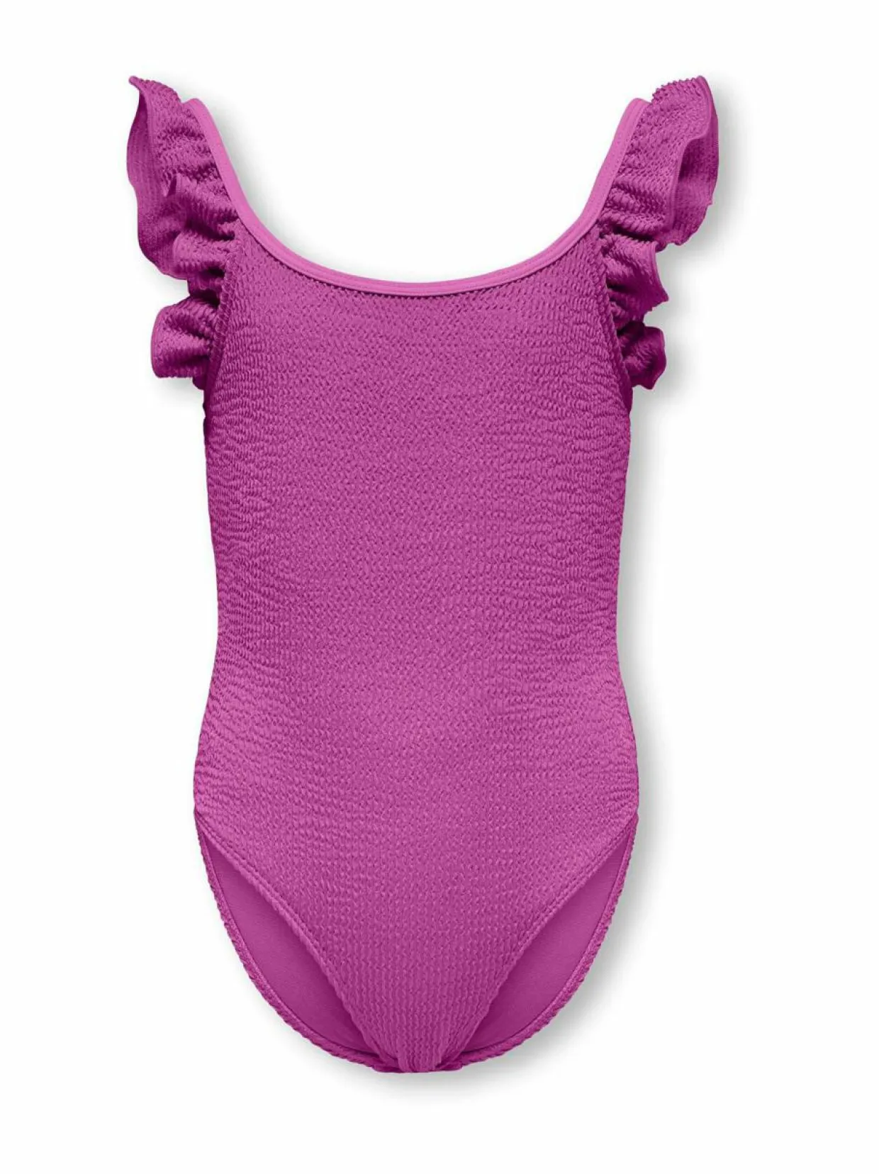 Kids Onlyn KogWave Structure -uimapuku on tyylikäs ja mukava valinta lapsille. Se on valmistettu 87 % polyesteristä ja 13 % elastaanista, mikä tekee siitä kestävän ja joustavan. Uimapuvussa on kaunis struktuuri sekä tyylikäs muotoilu ohuilla olkaimilla, joita täydentävät röyhelöt. Olkaimet ovat takaa säädettävät.