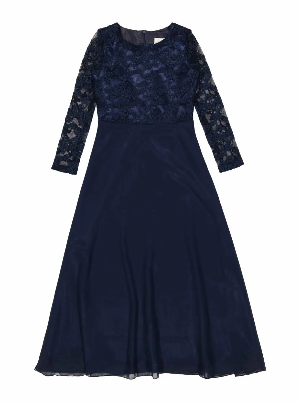 Mingnelinin kauniissa juhlamekossa on pitsinen yläosa ja pitkä, ilmava helma. Vyötäröllä on hohtava satiininauha ja takana vetoketjukiinnitys. Helman kangas on kaksinkertainen.