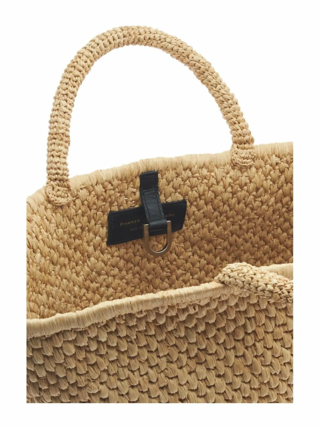 Proenza Schoulerin suuri Chelsea Tote -laukku on valmistettu luonnollisesta raffiasta. Siinä on ylhäältä leveämpi siluetti. Laukussa on T-mallinen, metallinen suljin. Siinä on kaksi virkattua kantokahvaa ja nahkainen olkahihna, joka on säädettävä ja irrotettava. Sisältä löytyy nahkainen, vetoketjullinen clutch-laukku, jossa voi säilyttää tärkeimpiä pientavaroita. Clutchin voi kiinnittää lenkistään laukun reunaan. Laukun edustaa koristaa logobrodeeraus.