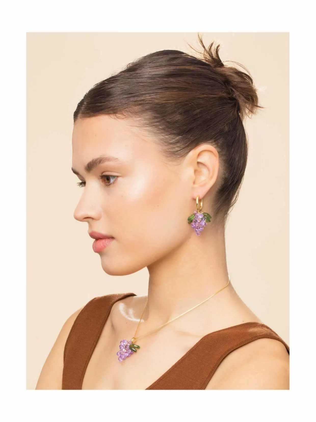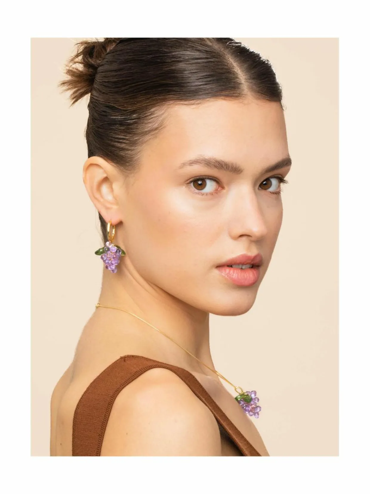 Lavender Jelly -korvakoruissa on 18k kullalla päällystetyt 925 sterling-hopearenkaat, lasihelmiä ja akryylilehdet. Lasihelmet ovat kiinni korussa kullatuilla messinkirinkuloilla.Korut valmistetaan käsityönä Suomessa.