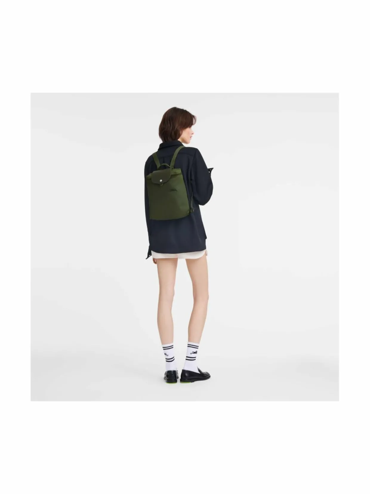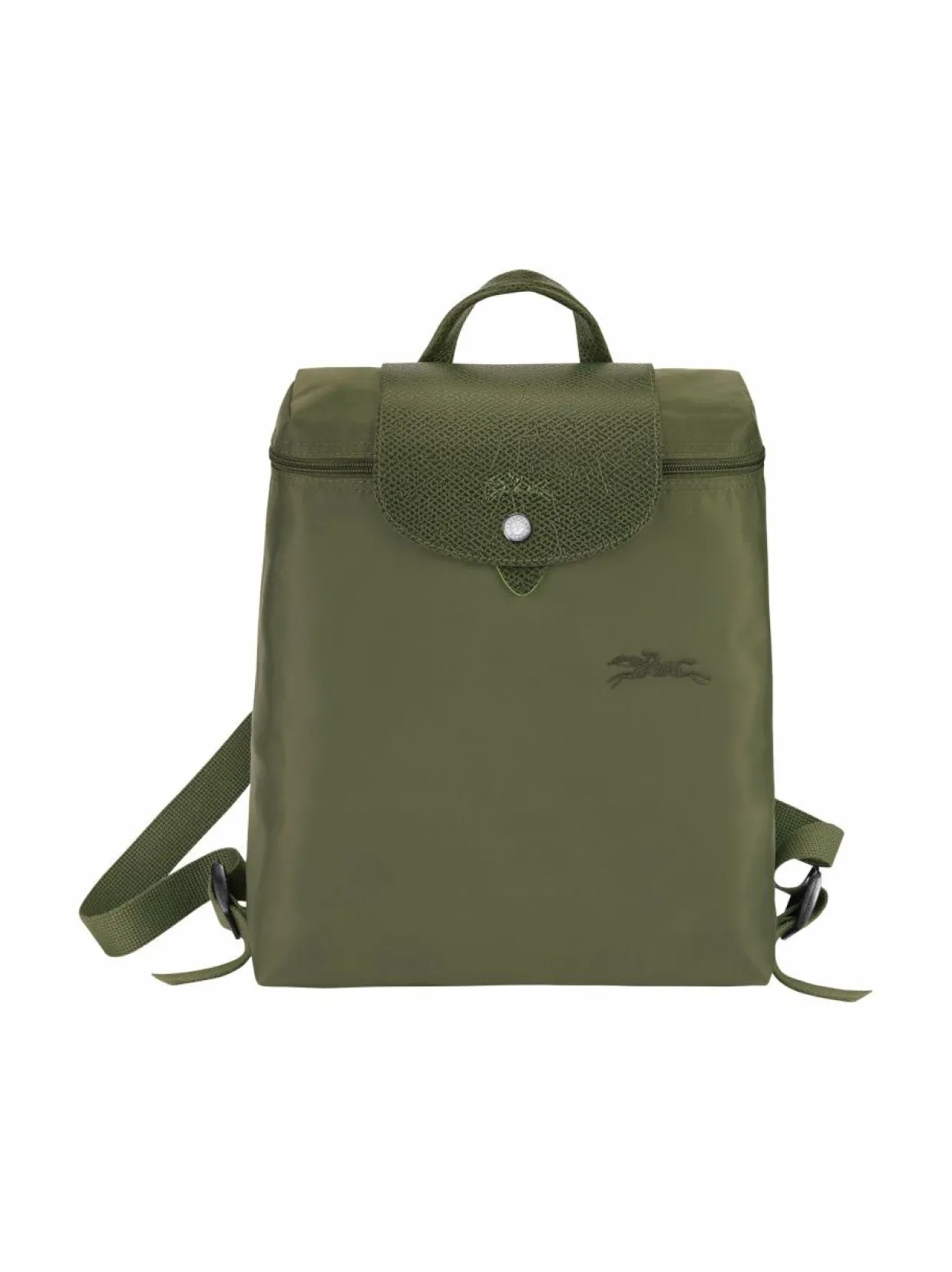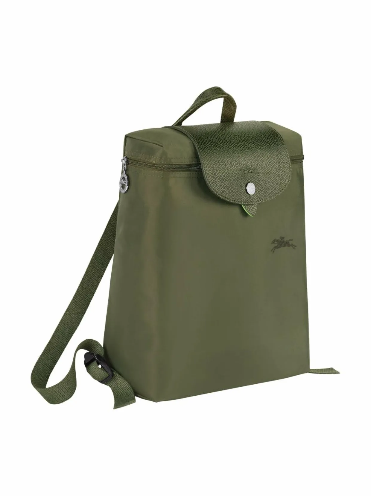 Le Pliage Green -malliston tuotteet ovat valmistettu kierrätetyistä materiaaleista, jotka on sisäpuolelta pinnoitettuja. Tämä kokoontaitettava reppu on kevyt ja se suljetaan sekä vetoketjulla että nahkaisella läpällä. Sisältä löytyy yksi avotasku. Ekologinen ja kestävä valinta päivittäiseen käyttöön.