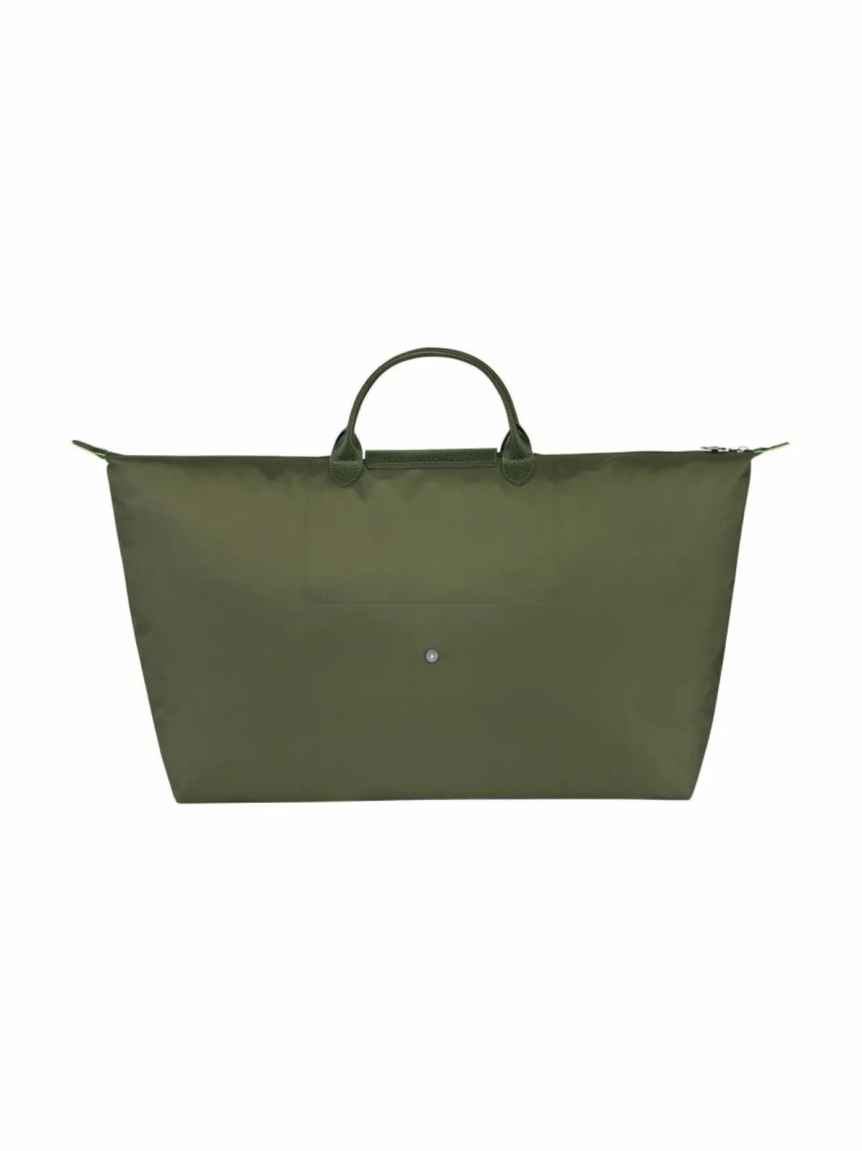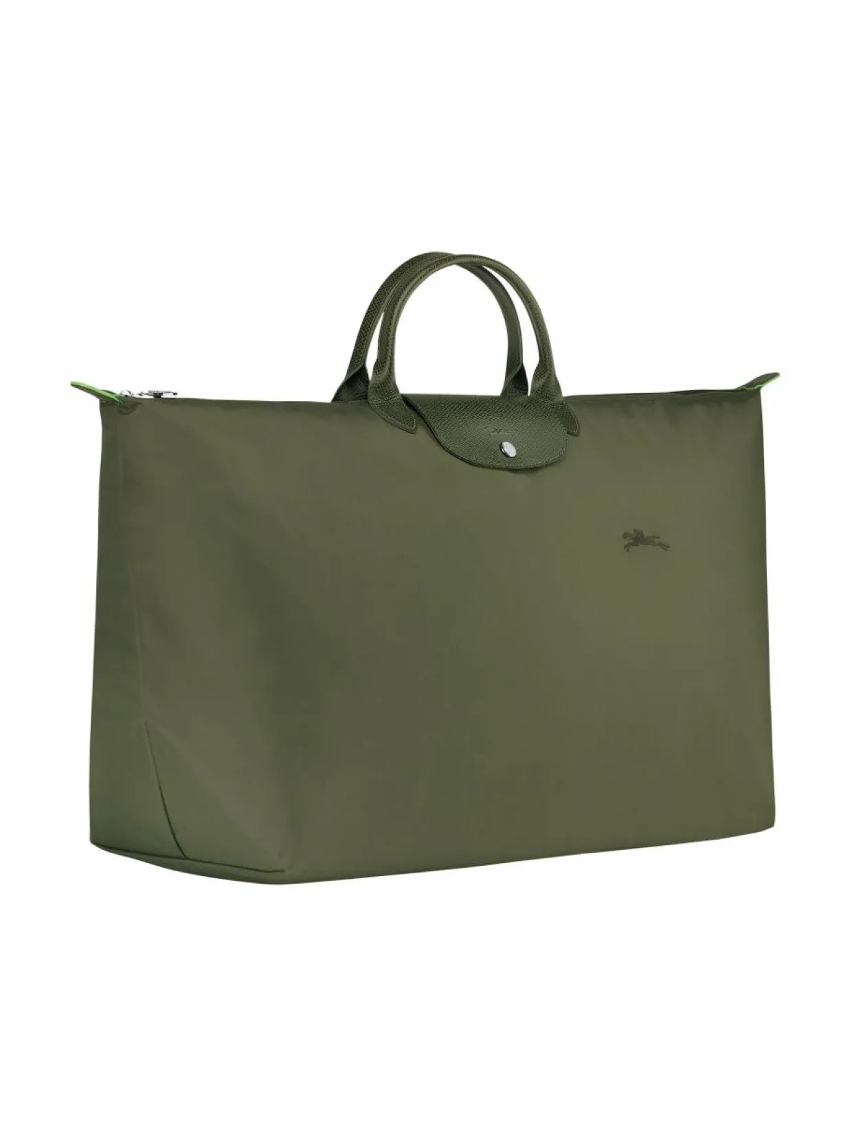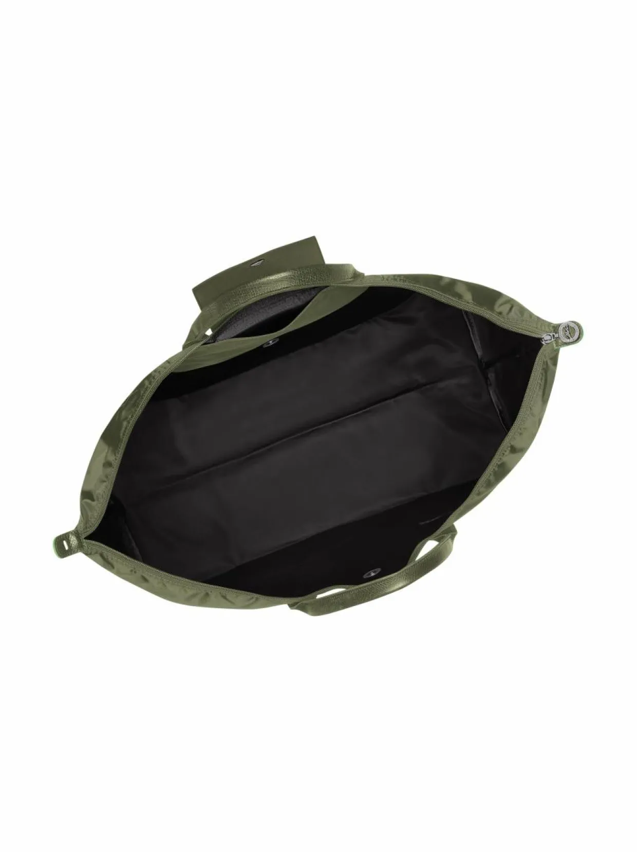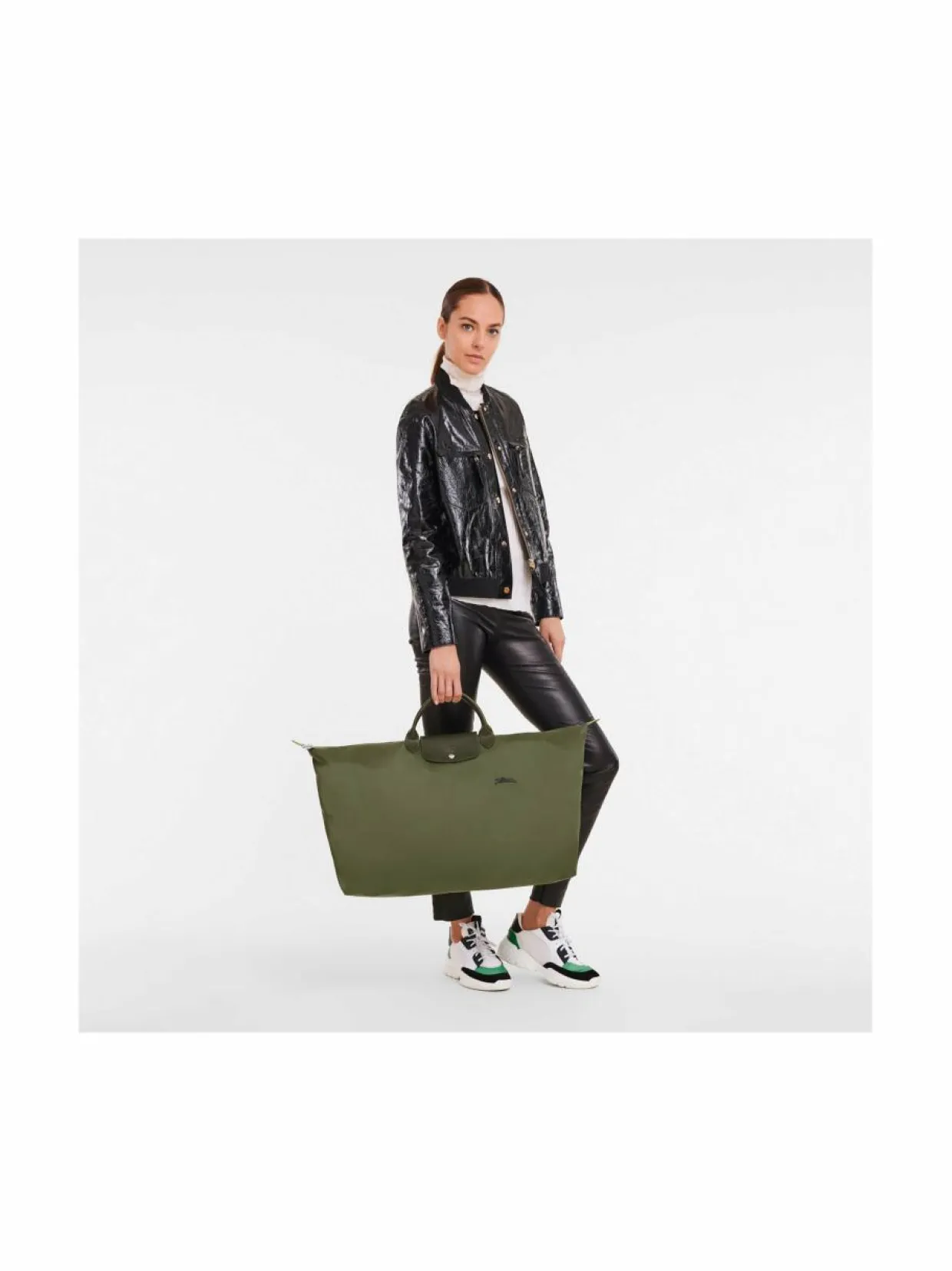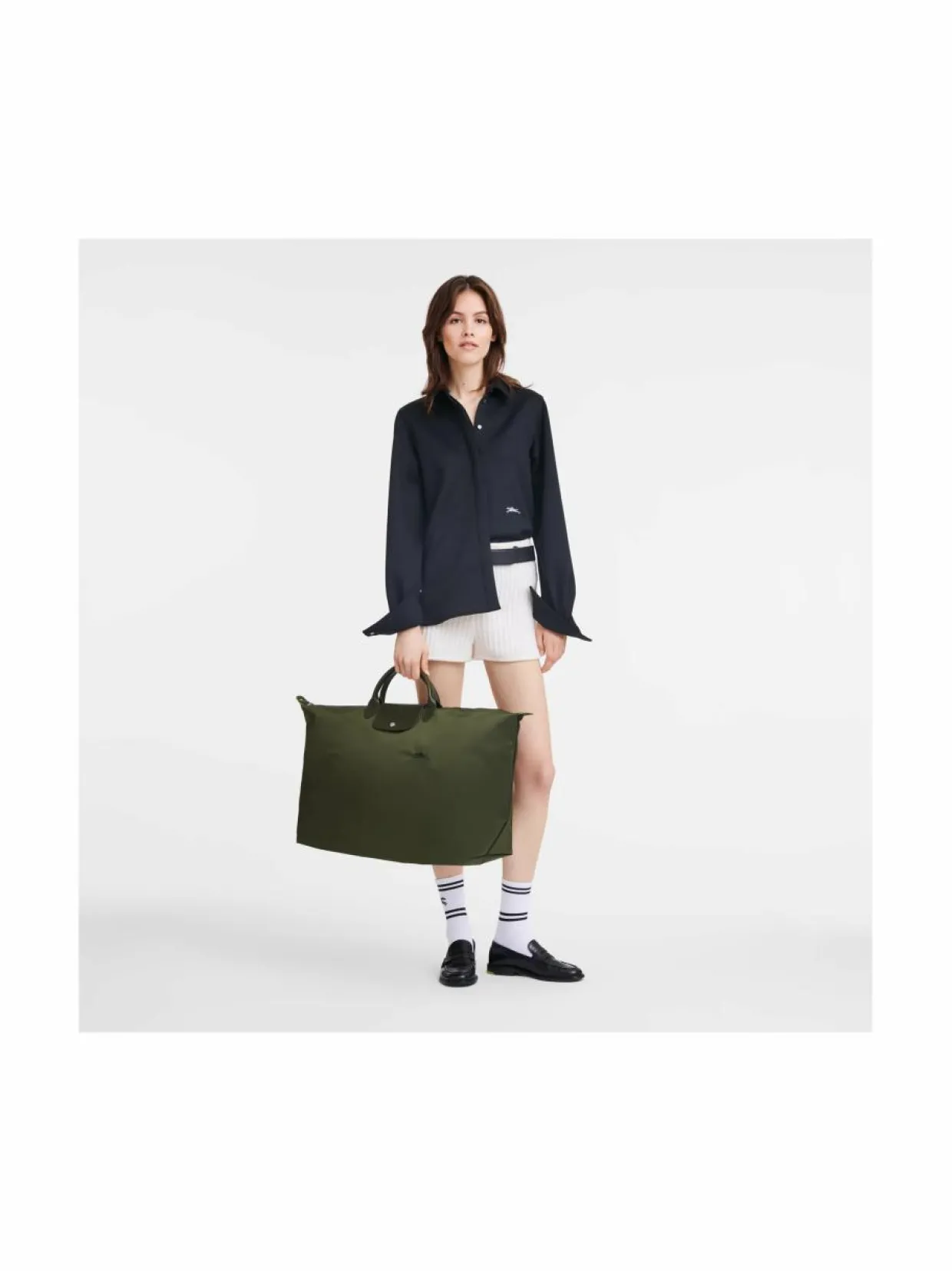 Longchampin ikonisen Le Pliage-sarjan kokoontaitettava matkakassi. Laukun päämateriaali on sisältä pinnoitettua kierrätettyä polyamiditekstiiliä ja kantokahvat ja läppä aitoa nahkaa. Laukku on kevyt kantaa ja siinä on vetoketjukiinnitys ja sisältä löytyy avotasku.