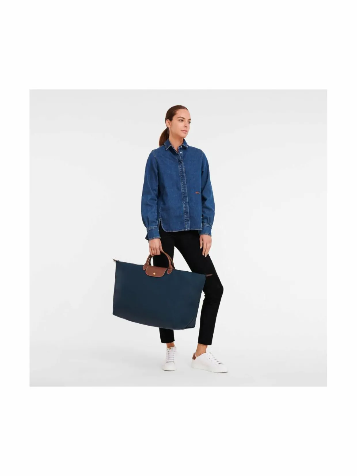 Longchampin ikonisen Le Pliage-sarjan kokoontaitettava matkakassi. Laukun päämateriaali on sisältä pinnoitettua polyamiditekstiiliä ja kantokahvat ja läppä aitoa nahkaa. Laukku on kevyt kantaa ja siinä on vetoketjukiinnitys ja sisältä löytyy avotasku.