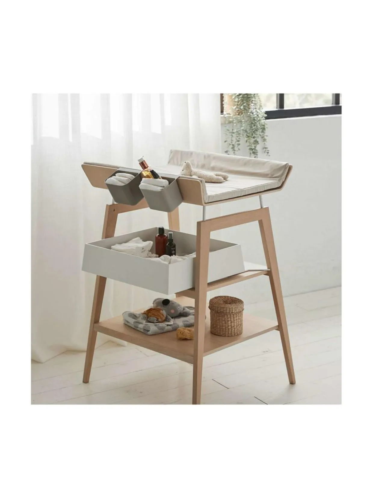 Leanderin Linea-hoitopöydällä vaipanvaihto sujuu mukavasti ja ergonomisesti. Pöydässä on lisäturvaa tuovat, korkeat laidat sekä säädettävät jalat, jotka voi asettaa sopivalle korkeudelle vanhemman pituuden mukaan. Pöydässä on kaksi hyllytasoa, joille mahtuvat kaikki tarpeelliset vaipanvaihtotarvikkeet. Tämä skandinaavista muotoilua ja käytännöllisyyttä yhdistävä hoitopöytä sopii erinomaisesti tyylitajuisille vanhemmille!