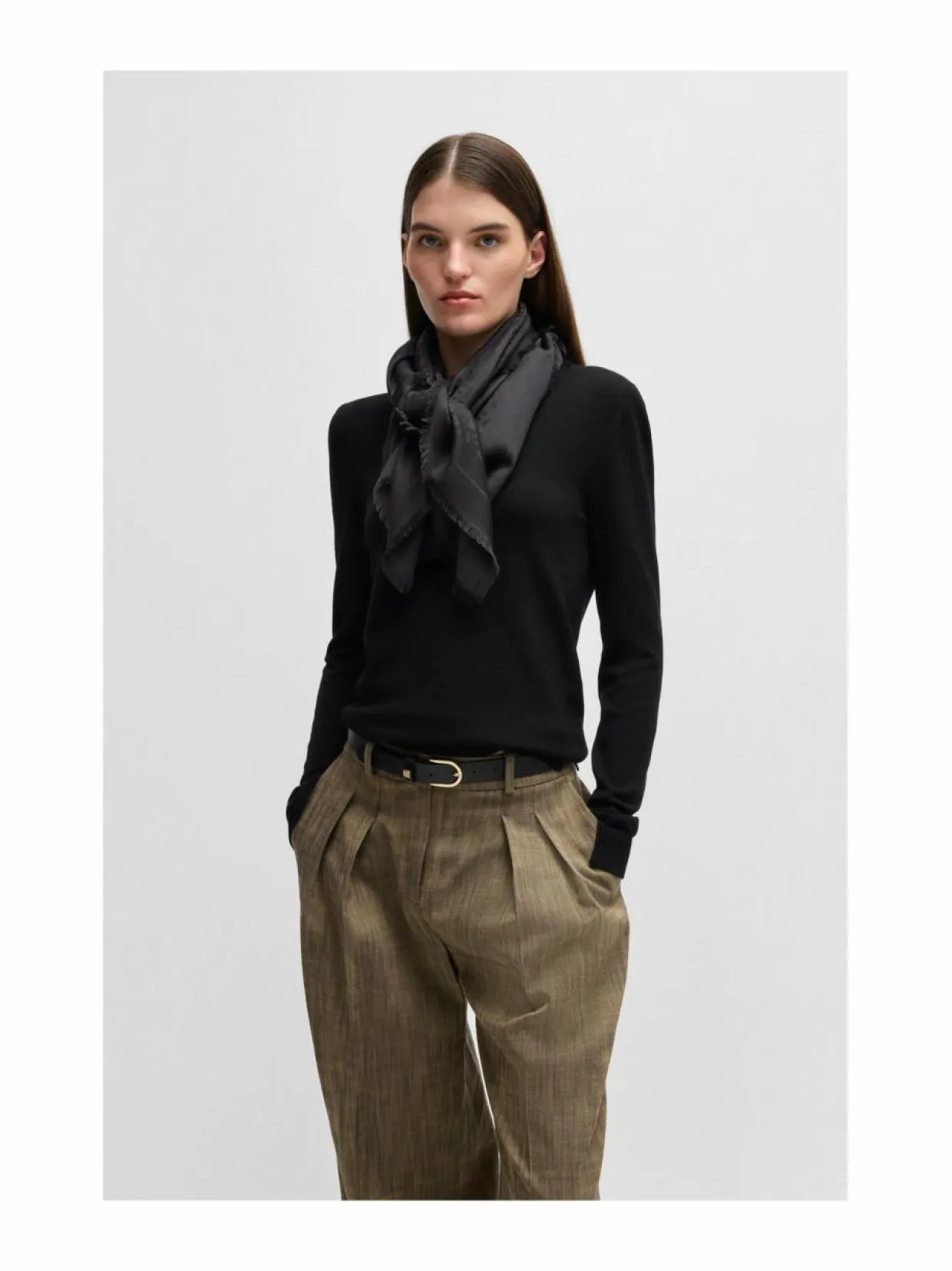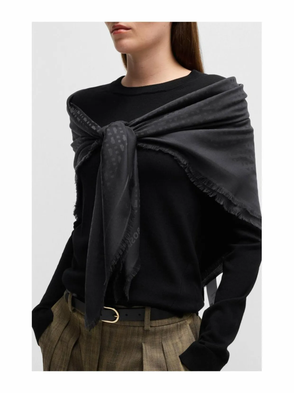 Boss-merkin huivi on valmistettu pehmeästä ja laadukkaasta materiaalista. Huivi on viimeistelty hienostuneella kuviolla ja siinä on Boss-logomerkki. Huivi on neliön muotoinen ja sen reunoissa on lyhyet hapsuviimeistelyt. Huivin materiaali on ihoa vasten pehmeää ja miellyttäväntuntuista iholle. Modaali on luonnollinen kuitu, joka on pehmeä ja hengittävä. Villa on luonnollinen kuitu, joka on lämmin ja kestävä.