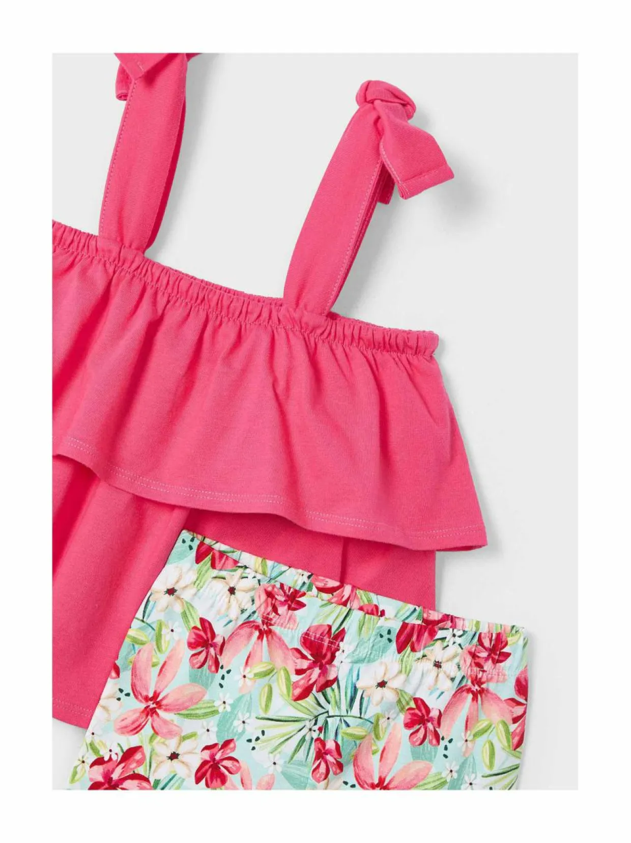 Mayoralin pakkaukseen kuuluu kaksi osaa: Rypytetty toppi sekä leggingsit. Topissa on leveät olkaimet ja solmut. Leggingseissä on kaunis kukallinen kuvio ja niiden vyötäröllä on joustava kuminauha. Vaatteet on valmistettu pehmeästä ja miellyttävästä puuvillatrikoosta. Ne ovat hengittävät ja helppohoitoiset.