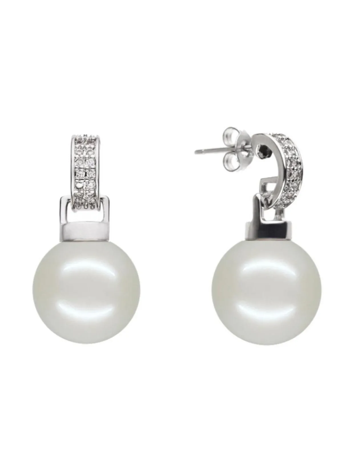 Klassiset valkoiset helmikorvakorut 10 mm helmiäishelmillä, kauniilla C-mallisella teräsrungolla ja zirkonialla.
