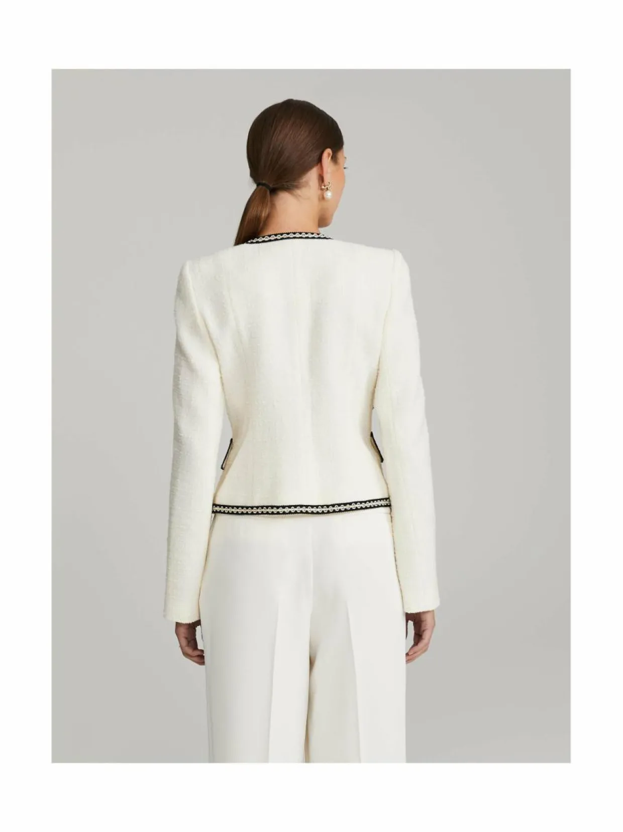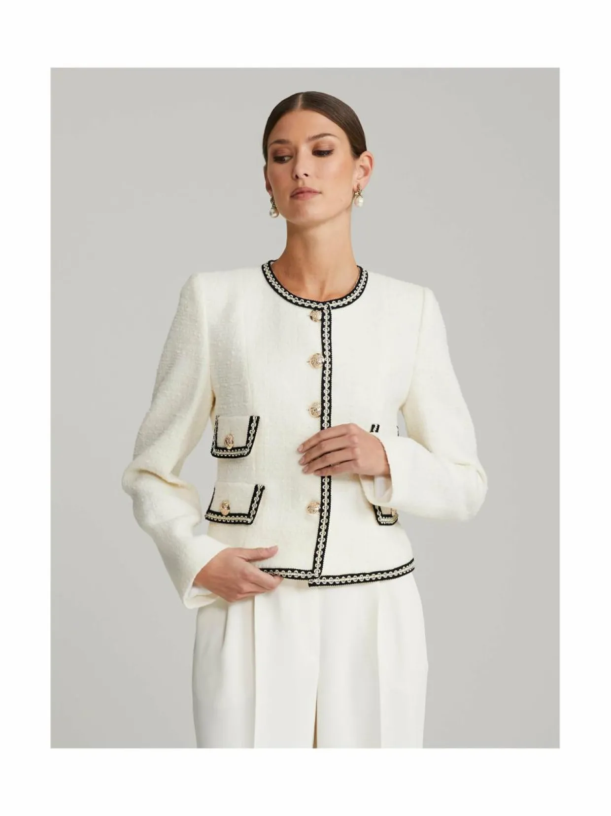 Klassinen Chanel-henkinen bleiseri, jossa pyöreä pääntie ja neljä valetaskua edessä. Kontrastiväriset yksityiskohdat lisäävät tyylikkyyttä ja luksusta. Helppo yhdistää erilaisiin toppeihin ja paitoihin sekä hameisiin ja housuihin. Materiaali on ylellistä villa-mohairsekoitetta.