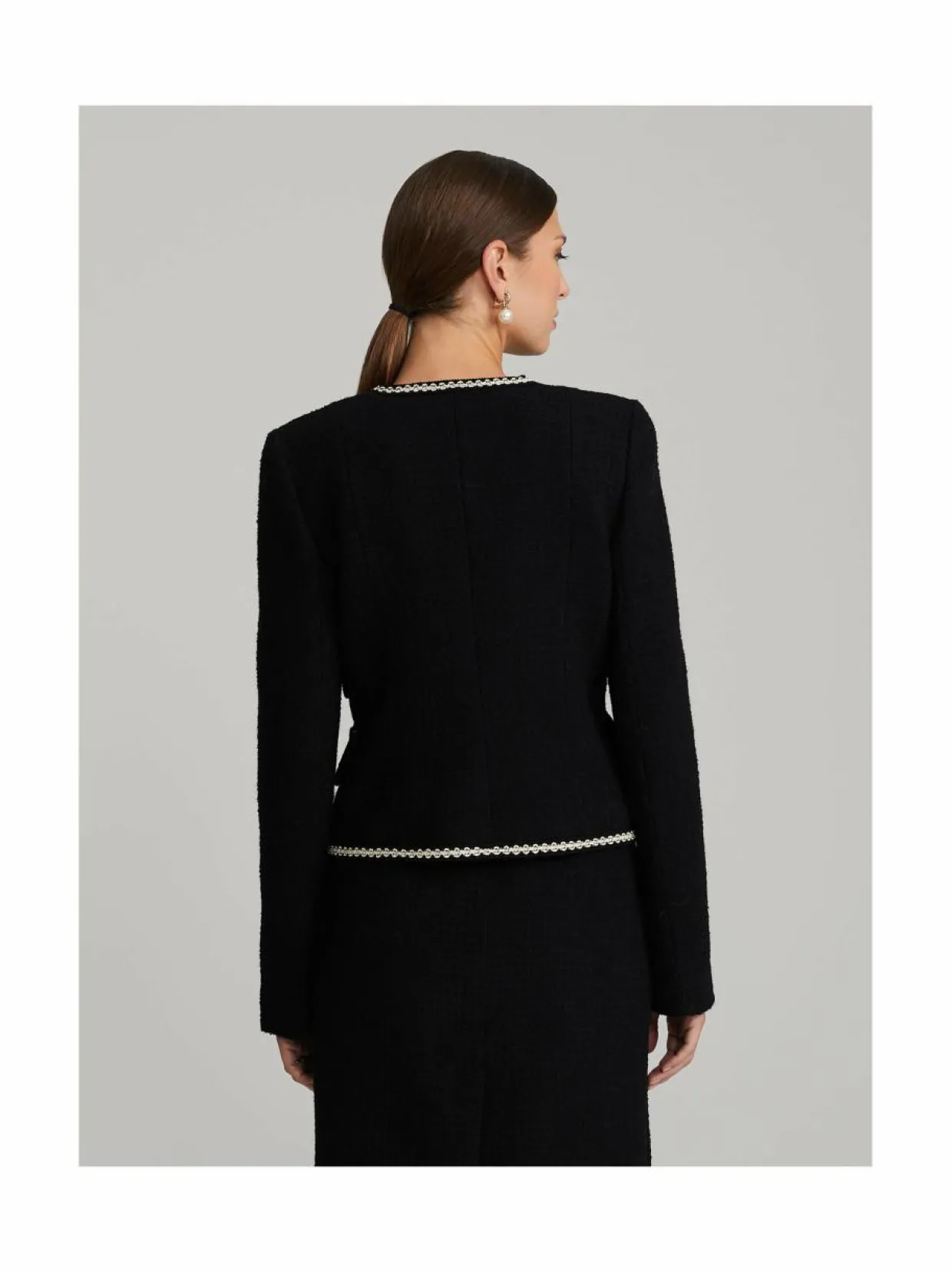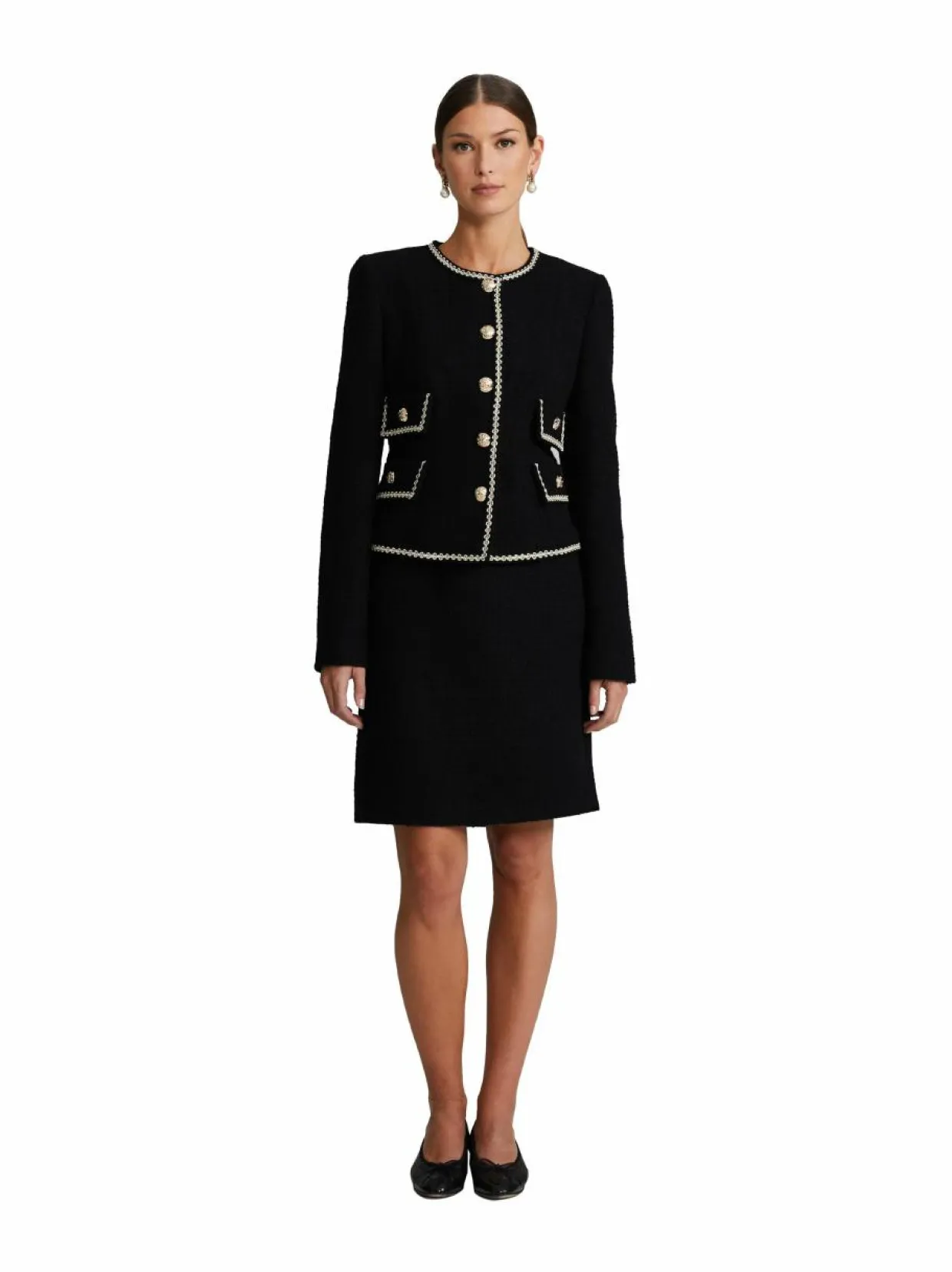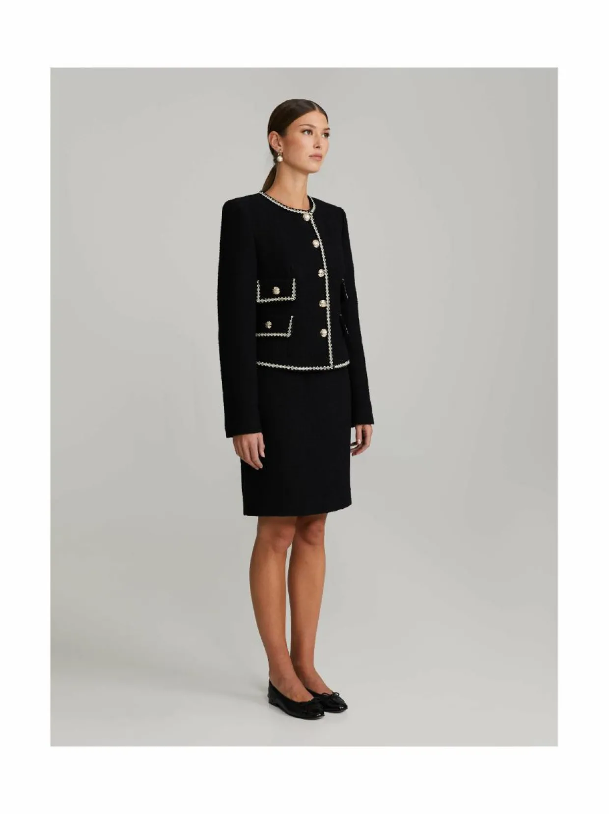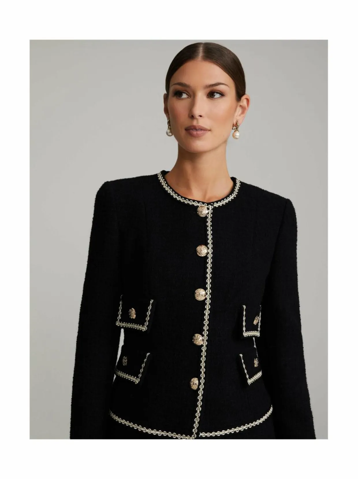 Klassinen Chanel-henkinen bleiseri, jossa pyöreä pääntie ja neljä valetaskua edessä. Kontrastiväriset yksityiskohdat lisäävät tyylikkyyttä ja luksusta. Helppo yhdistää erilaisiin toppeihin ja paitoihin sekä hameisiin ja housuihin. Materiaali on ylellistä villa-mohairsekoitetta.