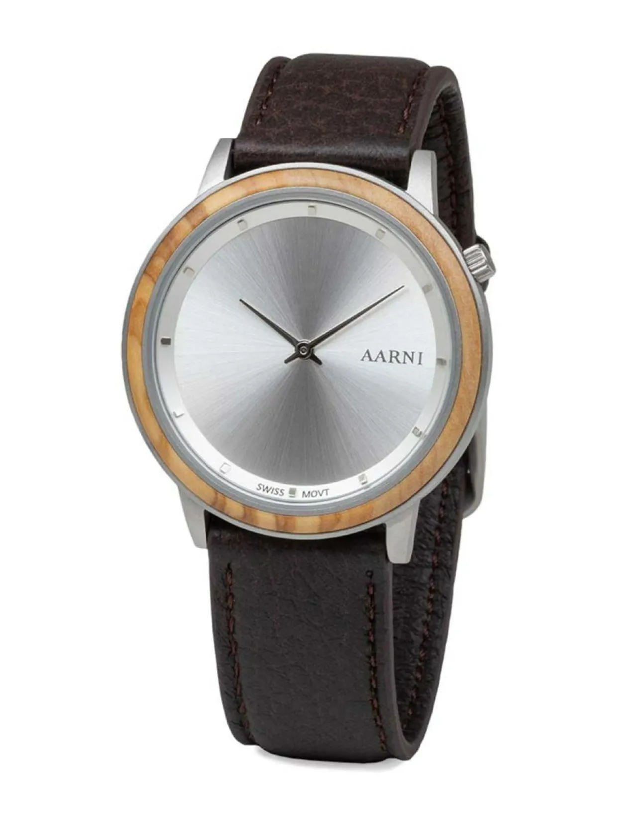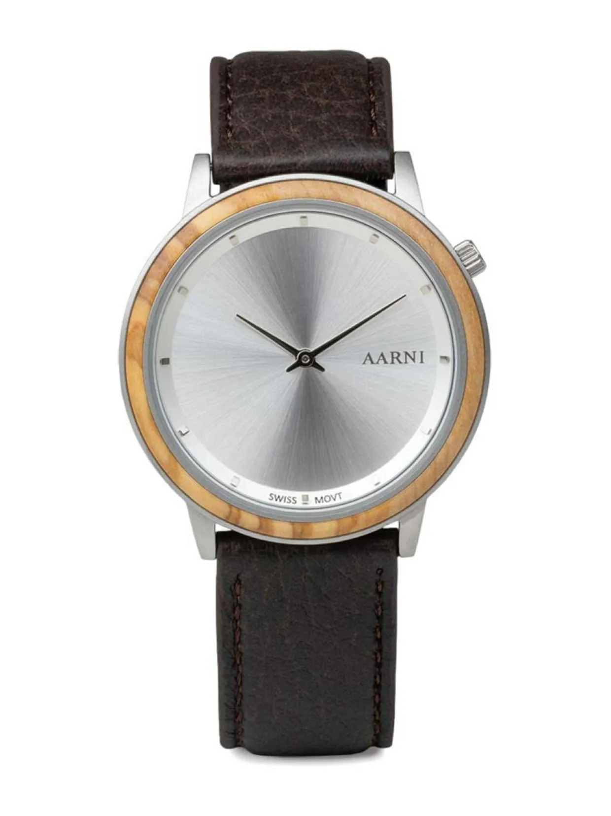 Ajatonta ja tyylipuhdasta arvokkuutta. Aarni Loihi on klassisen tyylikäs rannekello, jota kehystää oliivipuinen reunus. Kokonaisuuden täydentää kotimaisesta hirvennahasta valmistettu ranneke, joka hurmaa pehmeydellään. Kellon sydämenä toimii tarkka ja laadukas sveitsiläinen ETA-koneisto.