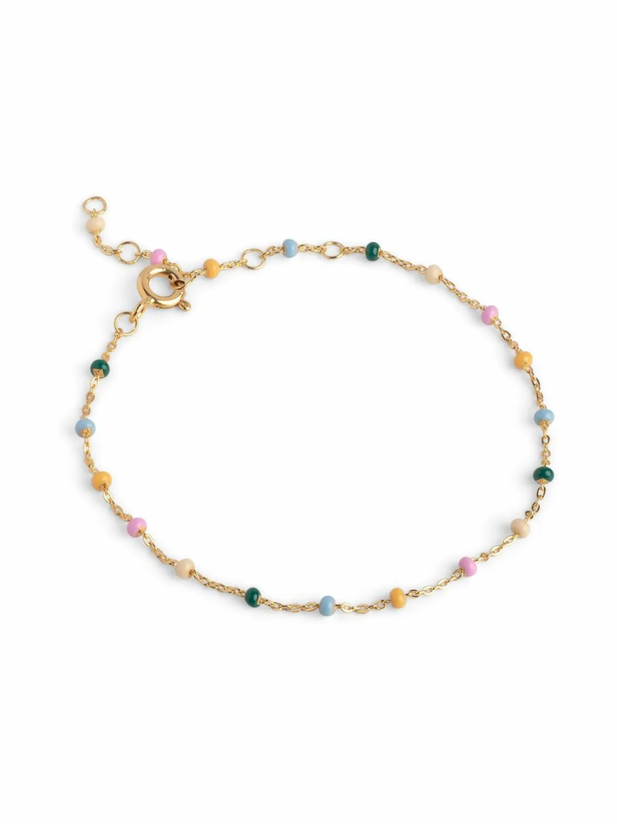 Ranneketju, jonka materiaali on 18 karaatin kullalla päällystettyä 925 sterling-hopeaa (hopeasta 87 % on kierrätettyä). Helmet ovat emalia. Koru luo ylellisen ja klassisen ilmeen.