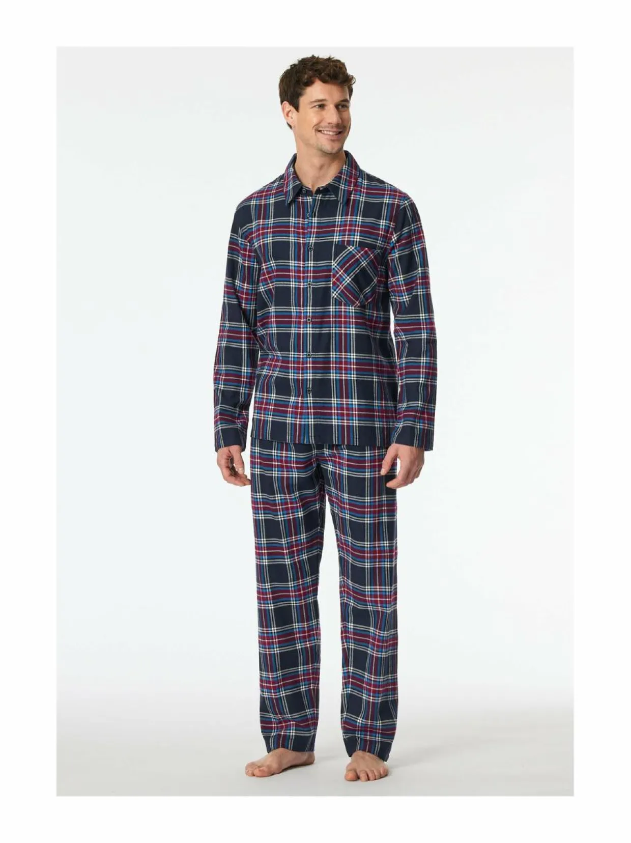 2-osainen klassinen pyjama ruutukuosissa. Settiin kuuluu napitettu pyjamapaita rintataskulla ja suoralahkeiset taskulliset housut säädettävällä ja joustavalla vyötärölinjalla. Materiaalina on käytetty pehmeän tuntuista puuvillaflanellia.