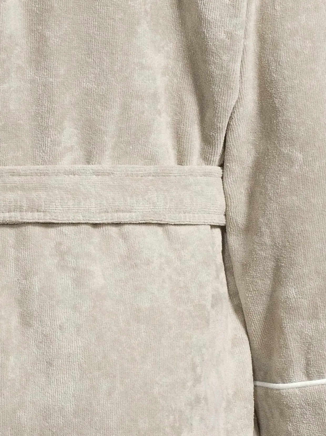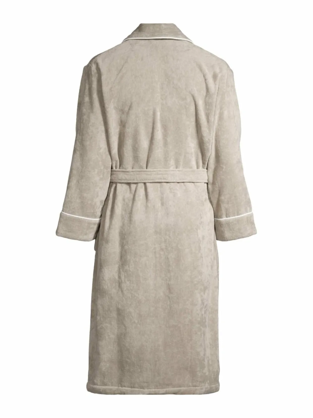 Villa Stockmannin Lounge-kylpytakki on imukykyistä puuvillavelouria, jonka lankaluku on 450. Eleganttia takkia koristavat kontrastiset poimut. Mallissa on kaksi paikkataskua ja sidottava vyö.