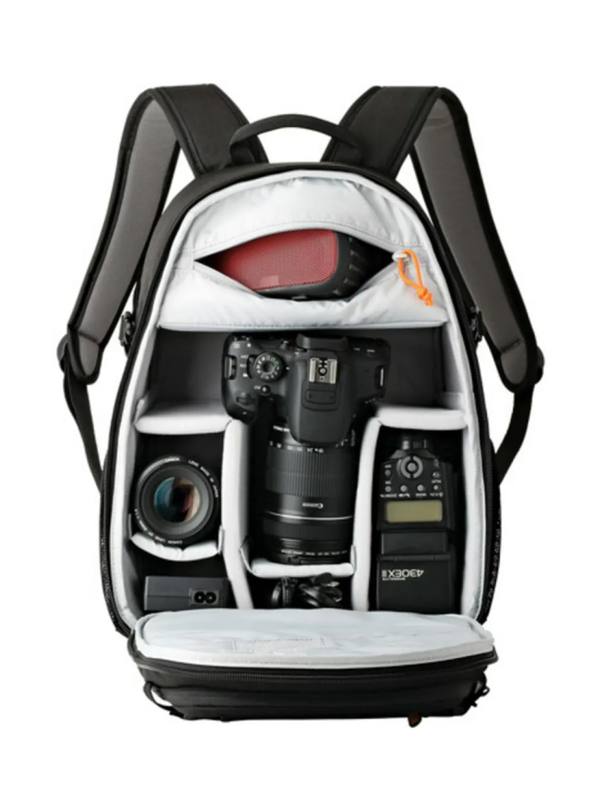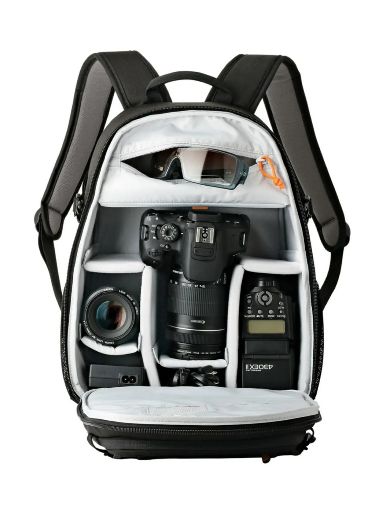 LowePro repun sisus on pehmustettu, ja täysin säädettävän sisuksen avulla voi muokata repun tarvitsemallesi kameralle ja varusteille. Repun etuosan sisäpuolella on suojaava tila (CradleFit™ -tasku) 10” tablet tietokoneelle sekä tasku pienille tarvikkeille ja muistikorttitasku.