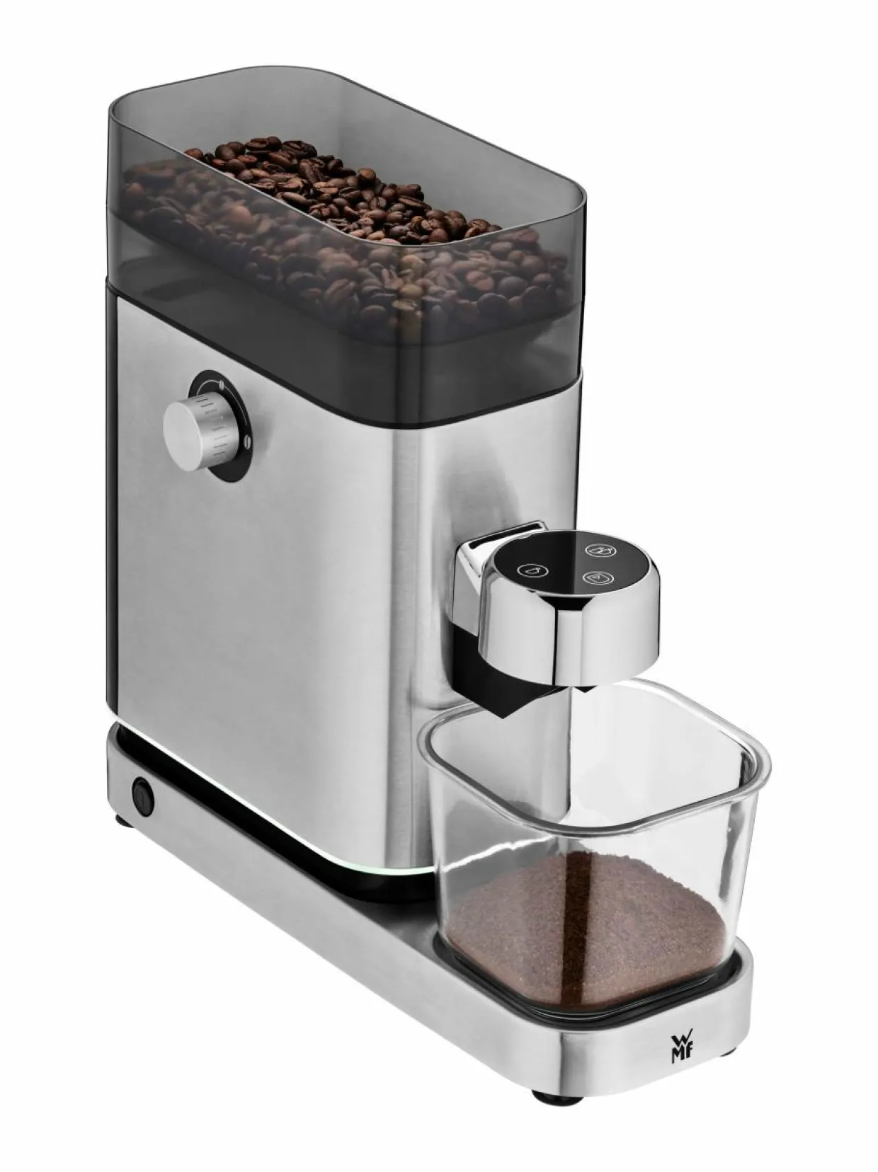 WMF Lumero -kahvimyllyssä on jopa 40 jauhatusastetta, joiden avulla voit säätää jauhatuksen tarkasti haluamaasi karkeuteen. Lumero jauhaa kahvipavut kaikkiin kahvijuomiin, halusitpa sitten hienon espressojauhatuksen, keskikarkean suodatinjauhatuksen tai karkean cold brew -jauhatuksen. Sen kartionmuotoinen jauhatusyksikkö on valmistettu ruostumattomasta teräksestä, mikä takaa laadukkaan ja tasaisen jauhatuksen. Laitteen runko on valmistettu WMF:n ruostumattomasta Cromargan® 18/10 -teräksestä. Kun haluat parhaan mahdollisen kahvielämyksen, käytä WMF Lumero -kahvimyllyä yhdessä WMF Lumero -espressokeittimen kanssa.