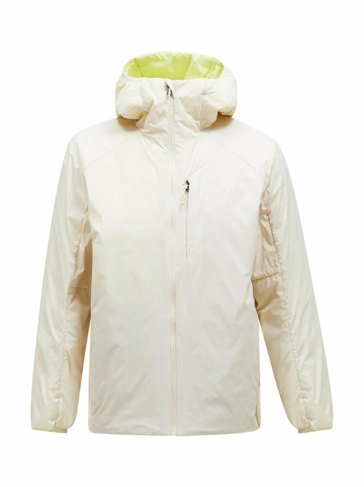 Peak Performancen M Freelight Reversible Hood -takki on kaksipuolinen ja erittäin kevyt. Se on valmistettu veden- ja tuulenpitävästä materiaalista ja siinä on kiinteä huppu. Hupussa on säätönauhat. Takissa on molemmilla puolilla taskut. Takki on täytetty kierrätetyllä polyesterillä. Yksi puoli on hillityn sävyinen ja toinen puoli on värikäs. Takki on pieneen tilaan pakattava, joten se on helppo ottaa mukaan matkalle. Se sopii erinomaisesti ulkoiluun ja arkikäyttöön.