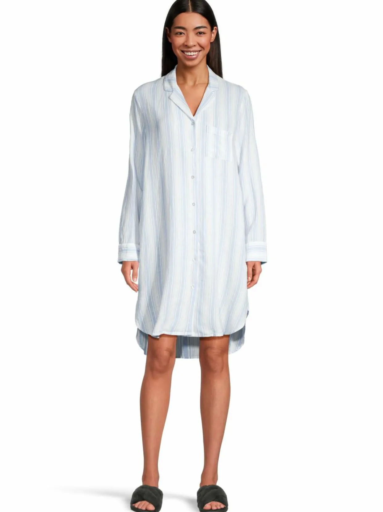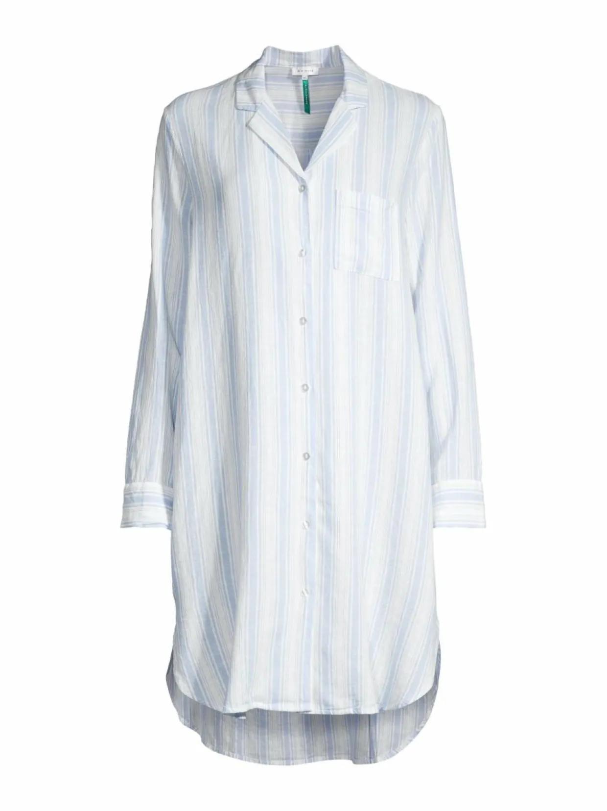 Stockmannin oman käyttövaatemalliston A+moren yöpaita on valmistettu pehmeästä pellava-viskoosista. Raidallinen Maggie-yöpaita toimii hyvin myös kevyenä paitamekkona hellepäivillä. Yöpaidan edessä on kokopitkä napitus. Vaate on suunniteltu rentoon istuvuuteen.