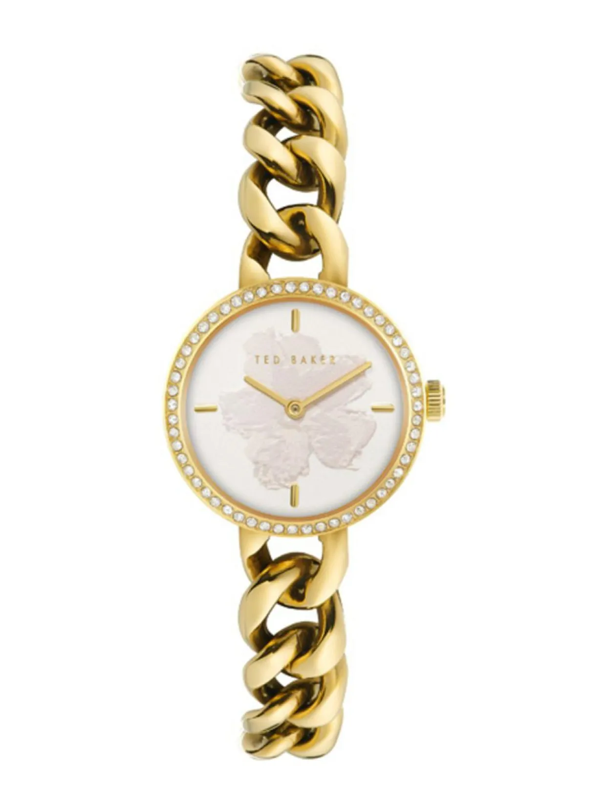 Ted Baker Maiisie 28mm rannekello on kuin kaunis koru. Kullanvärinen kuori on ruostumatonta terästä ja sen leveys on 28mm ja korkeus on 7mm. Kullanvärinen ranneke on ruostumatonta terästä ja valkoisessa kellotaulussa on magnolia kukka. Kellossa on mineraalilasi ja kvartsikoneisto. Kellon vesitiiviys on 5ATM. Ted Baker kelloilla on 2 vuoden takuu