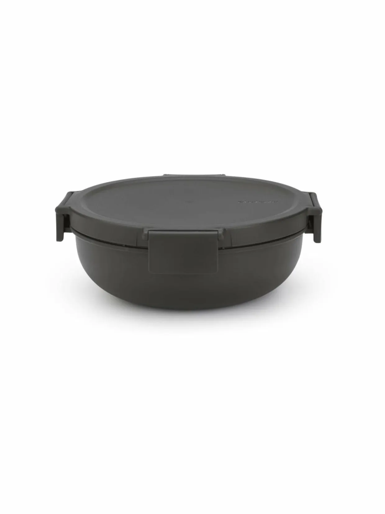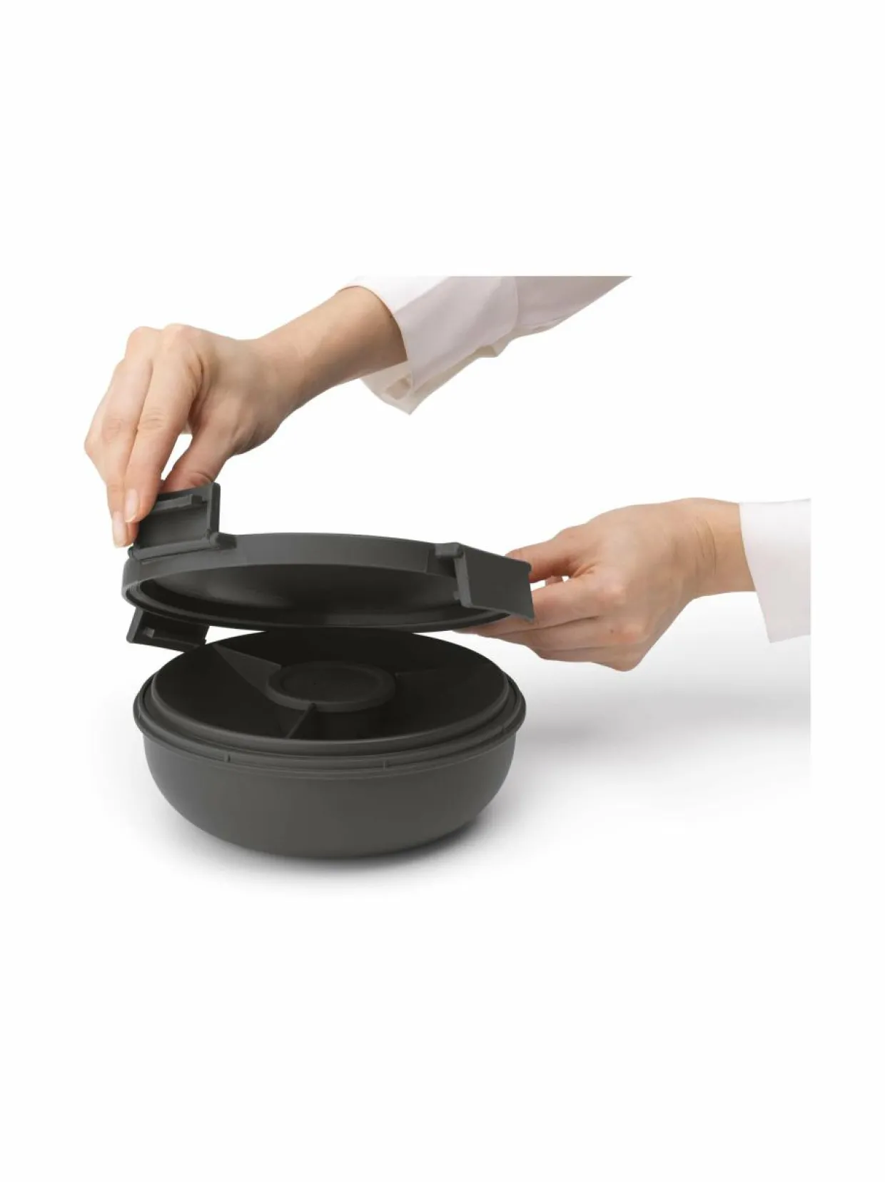 1,3 litran Brabantia Make & Take -salaattikulholla salaatin ottaminen evääksi on helppoa ja hauskaa. Tässä mahtavassa kulhossa on erillinen lokero täytteille ja säiliö salaatinkastikkeelle, joka toimii myös tulppana. Vedä säiliö ulos ja ravista kulhoa varovasti sekoittaaksesi täytteet, lisää kastike ja nauti. Supersalaateille.