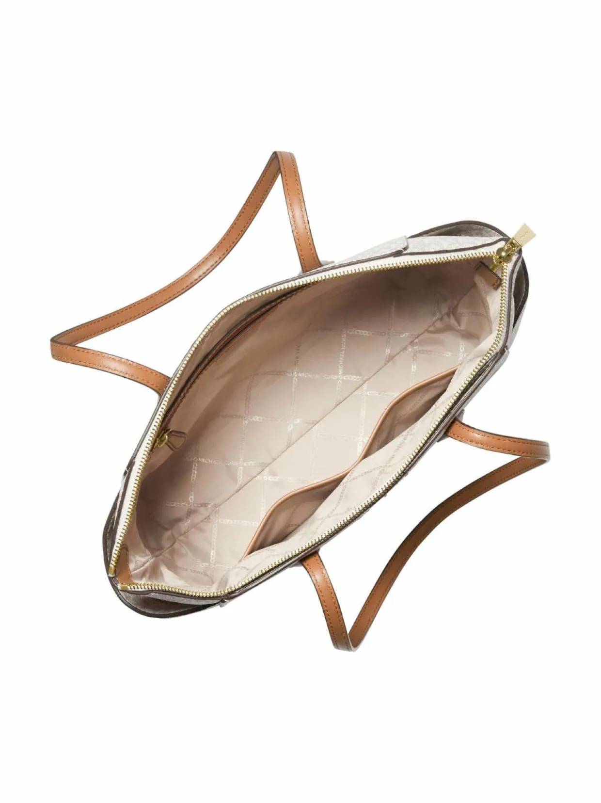 Keskikokoinen tote-mallinen olkalaukku monogrammikuosissa. Etupuolta koristavat kultainen logoteksti sekä logoriipus. Laukku suljetaan vetoketjulla. Sisällä tekstiilivuori, kaksi avotaskua sekä vetoketjullinen lisätasku. Laukun sivuissa on myös taskut ja pohjassa vahvikkeet.