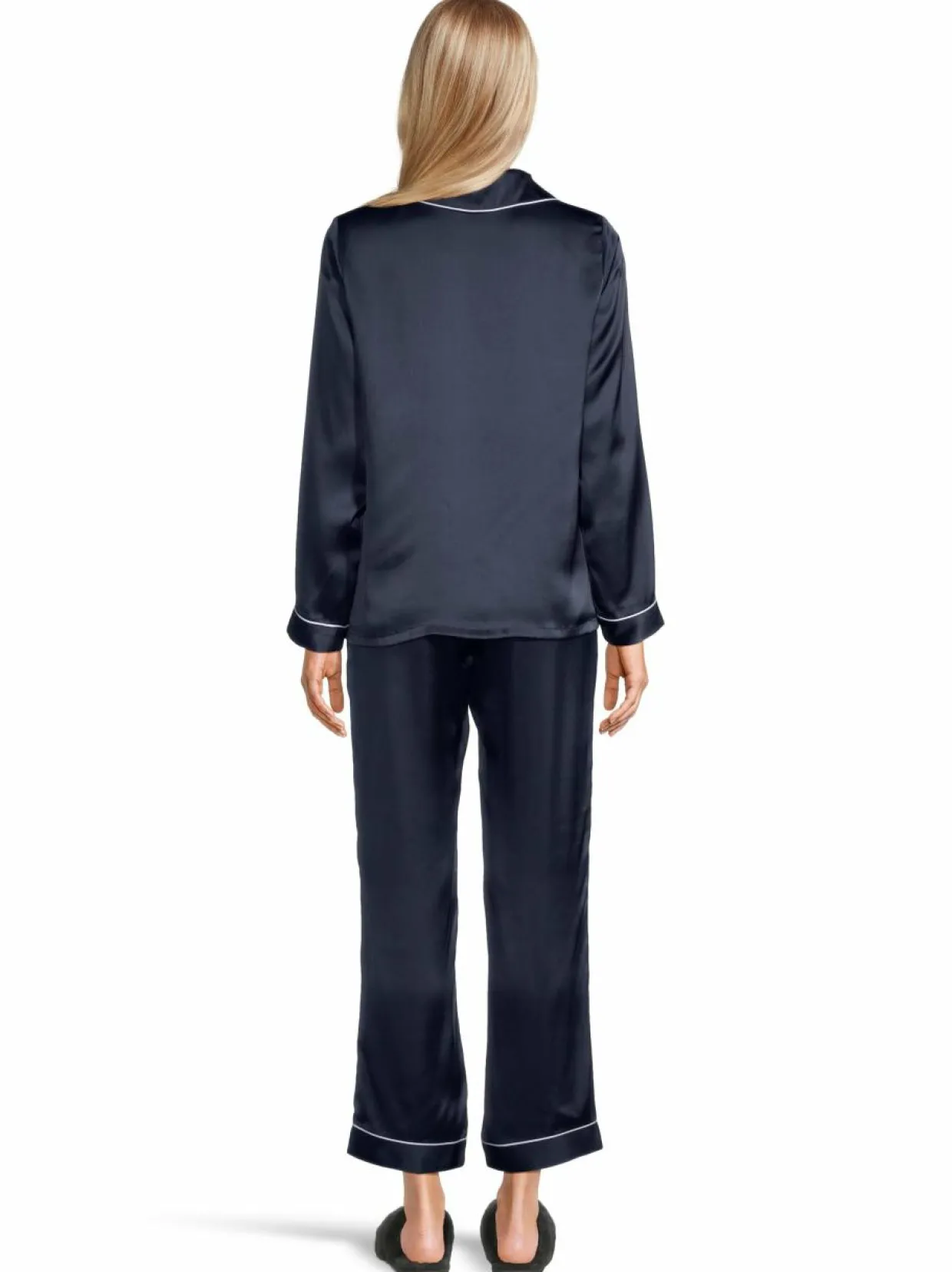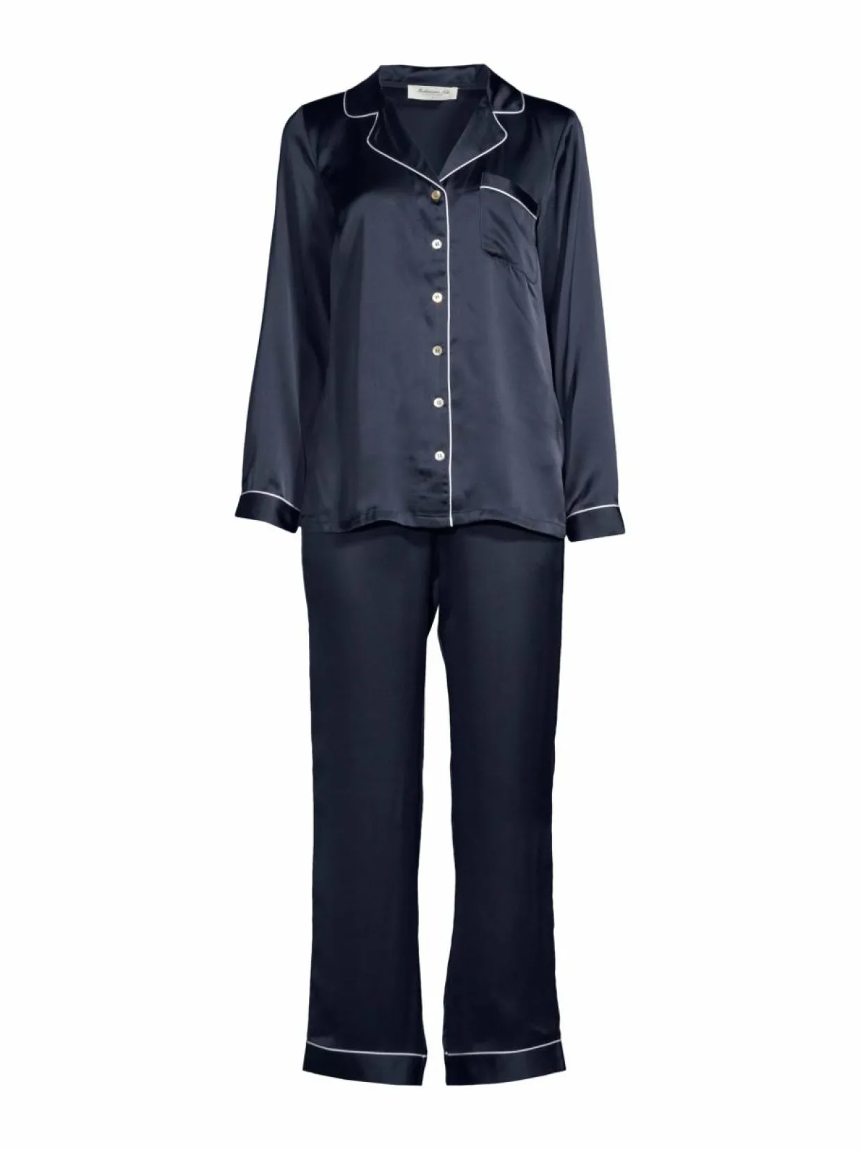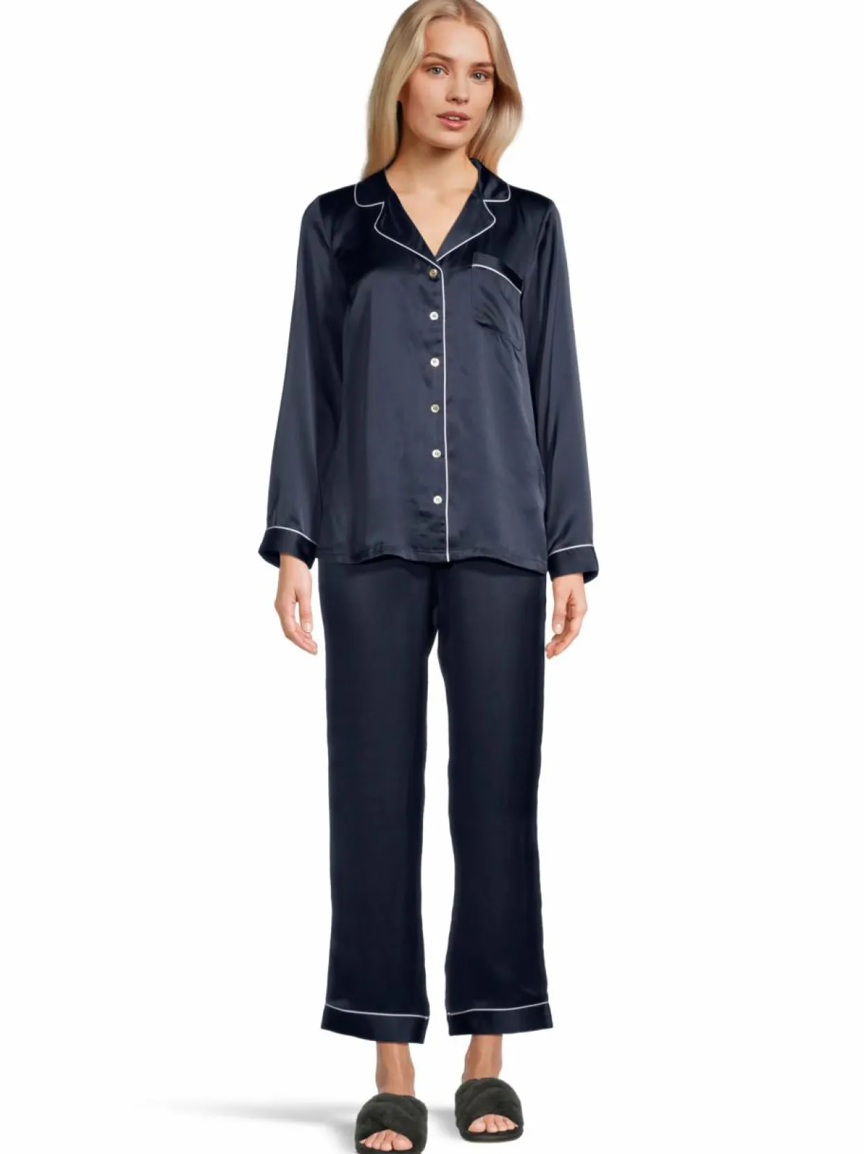 Ylellisestä silkkisatiinista valmistettu setti, johon kuuluu yöpaita ja yöhousut.