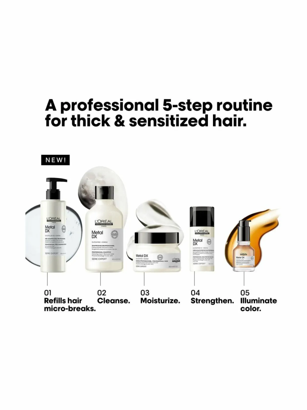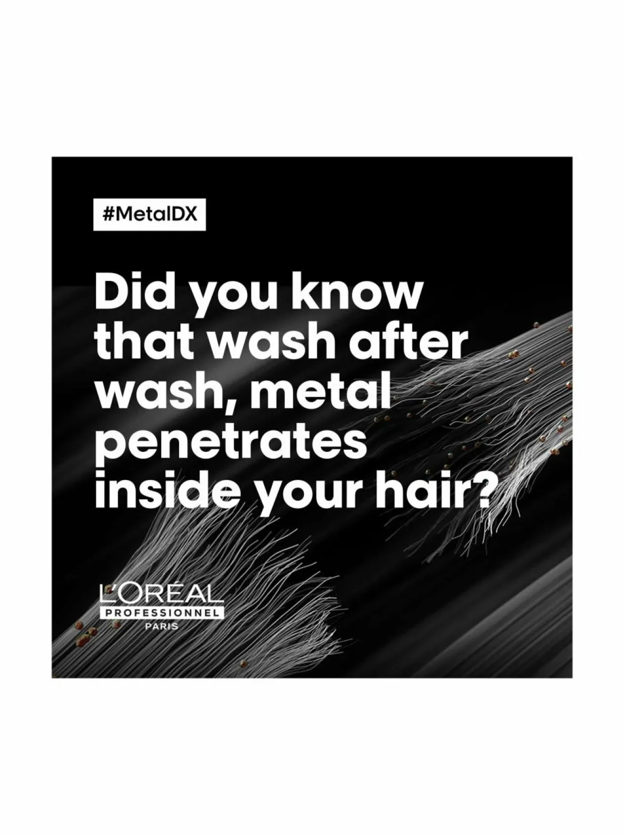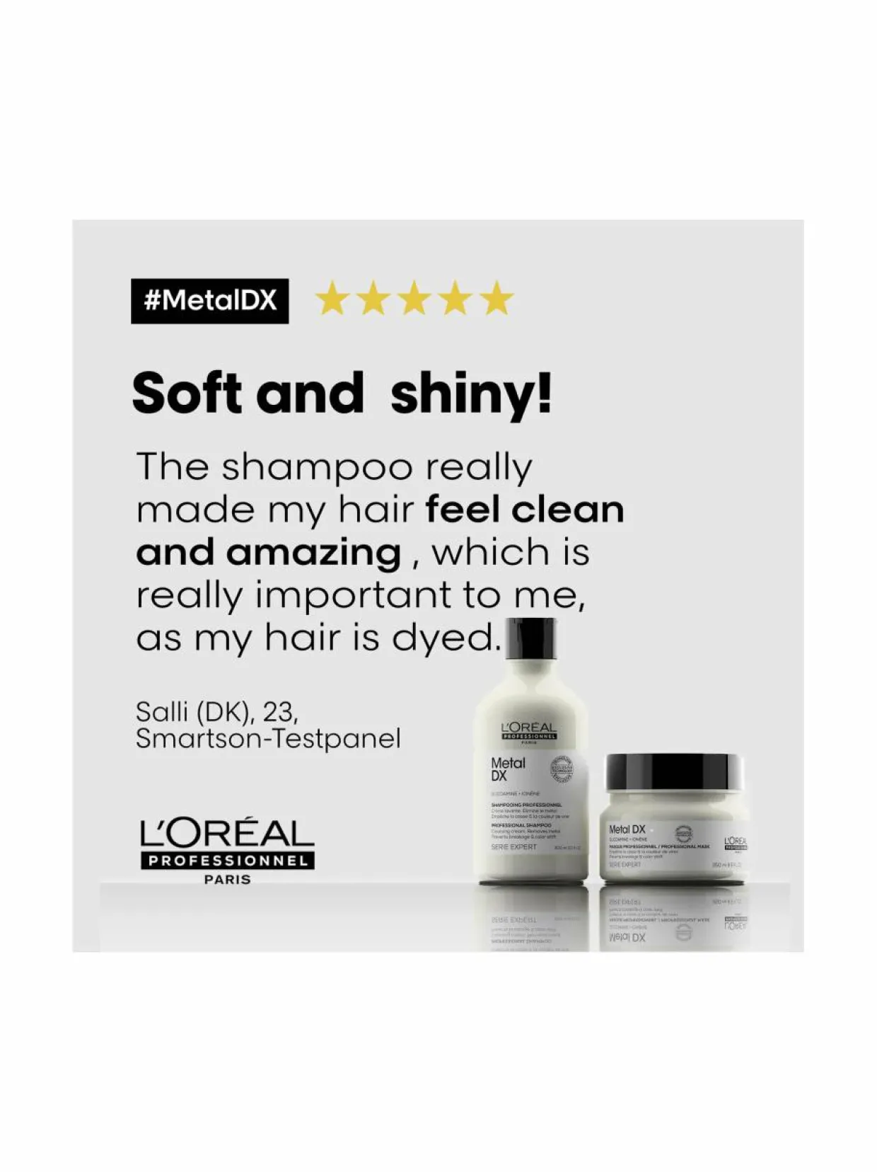 Pesu pesulta metallihiukkasia, kuten kuparia, läpäisee hiuksen pinnan. Metallihiukkaset voivat aiheuttaa riskin hiusten katkeilulle ja hiusvärin muutoksille.Tämä shampoo sisältää Glicoamine ja Ionen -ainesosia, puhdistaa hiuskuituja poistamalla metallihiukkasten kertymiä, kuten kuparia, sekä ravitsee hiuksia.Shampoota suositellaan käyttämään kaikkien ammattimaisten värjäys- ja vaalennuspalveluiden jälkeen. Hiukset ovat hellävaraisesti puhdistetut ja metallihiukkaset poistetut. Hiuksiin palautuu niiden kiilto ja hyvinvoiva ilme. Värjäystulokset ovat luotettavampia ja hiuksista tulee vahvemmat hiustenpesussa ja ne ovat suojatummat UV-säteiden altistukselta.**Shampoolla on täyteläinen ja voidemainen koostumus, joka vaahtoutuu ja on helppo huuhdella.Sopii kaikille rakenteille, värjätyille, vaurioituneille, vaalennetuille ja käsittelemättömille hiuksille. Tämä shampoo on osa Metal DX -tuotesarjaa, joka suojaa hiuksia hiukkasten kertymiä vastaan vähentäen hiusten katkeilua ja hiusvärin muutoksia. Metal DX on kehitetty yhteistyössä väri-, balayage- ja vaalennuksen ammattikampaajien kanssa.
