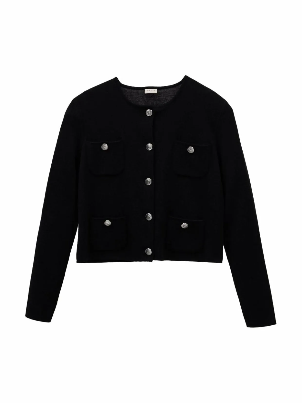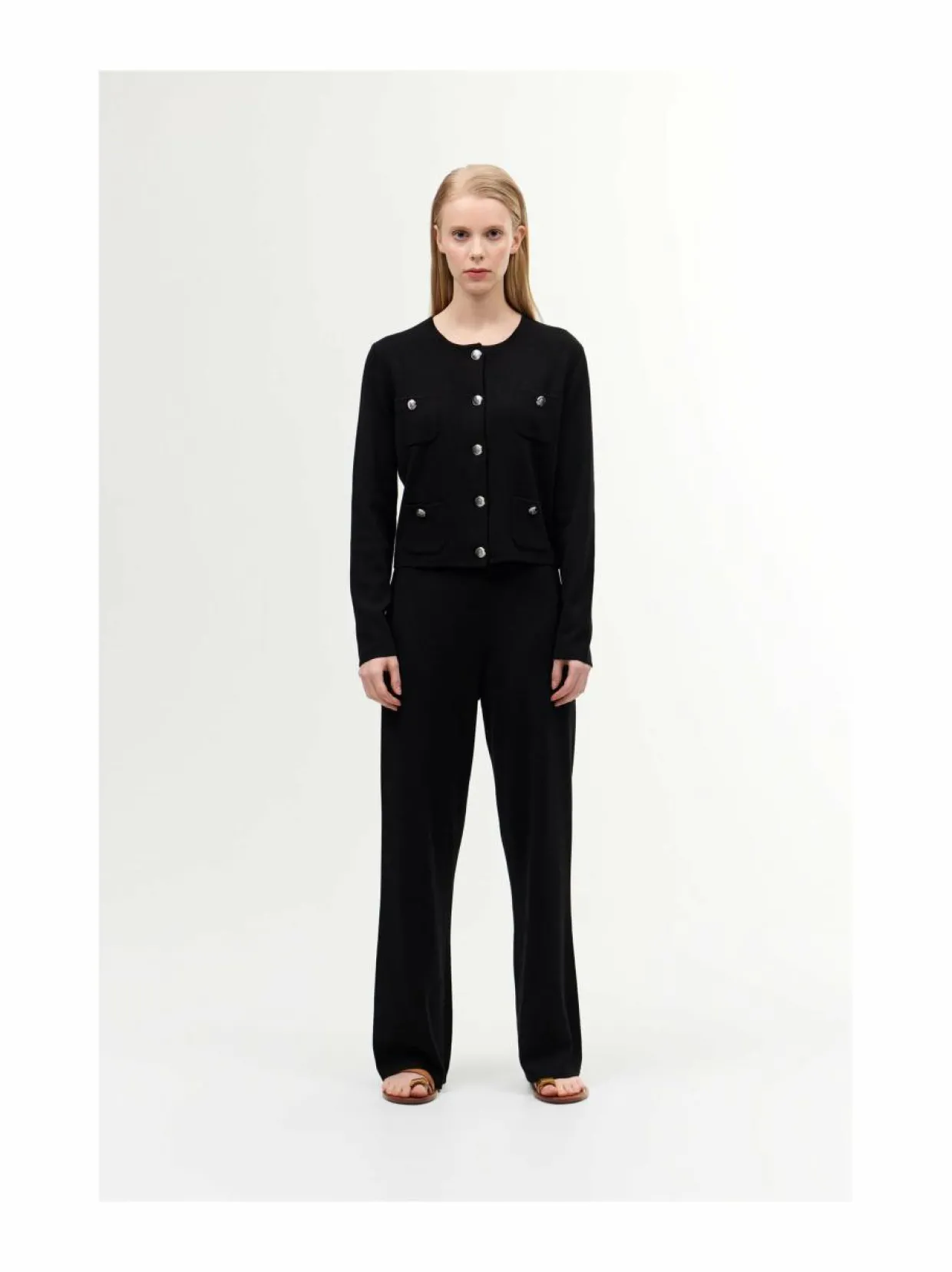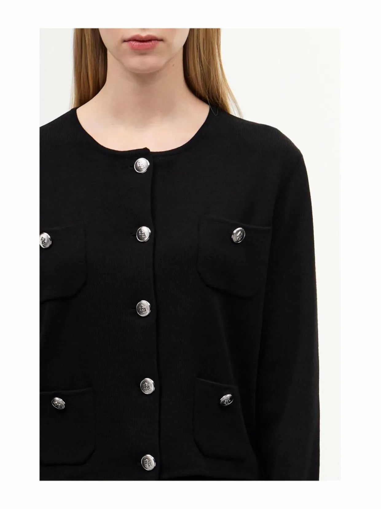 Tämä neule on valmistettu pehmeästä merinovillasta, joka tarjoaa erinomaisen lämmön ja mukavuuden. Sen suunnittelussa on kiinnitetty huomiota yksityiskohtiin, kuten koristeellisiin nappisomisteisiin ja taskuihin. Neuleen istuvuus on huoliteltu ja se luo ajatonta eleganssia. Merinovilla on hengittävä materiaali, joka tuntuu miellyttävältä iholla ja sopii monenlaisiin tilanteisiin.