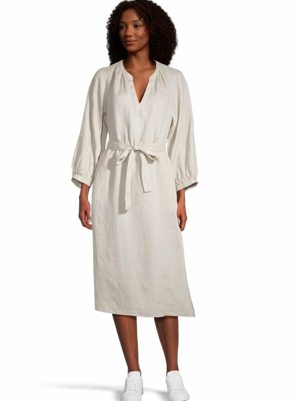 Essentials by Stockmannin Monika-mekko on täydellinen yhdistelmä luonnollista eleganssia ja käyttömukavuutta. Pellavakankaan hengittävyys ja kevyt tuntuma tekevät siitä erinomaisen valinnan lämpimiin päiviin. Solmittava vyö korostaa kauniisti siluettia, kun taas 3/4-pituiset hihat ja V-pääntie lisäävät ilmeeseen rentoa tyylikkyyttä.