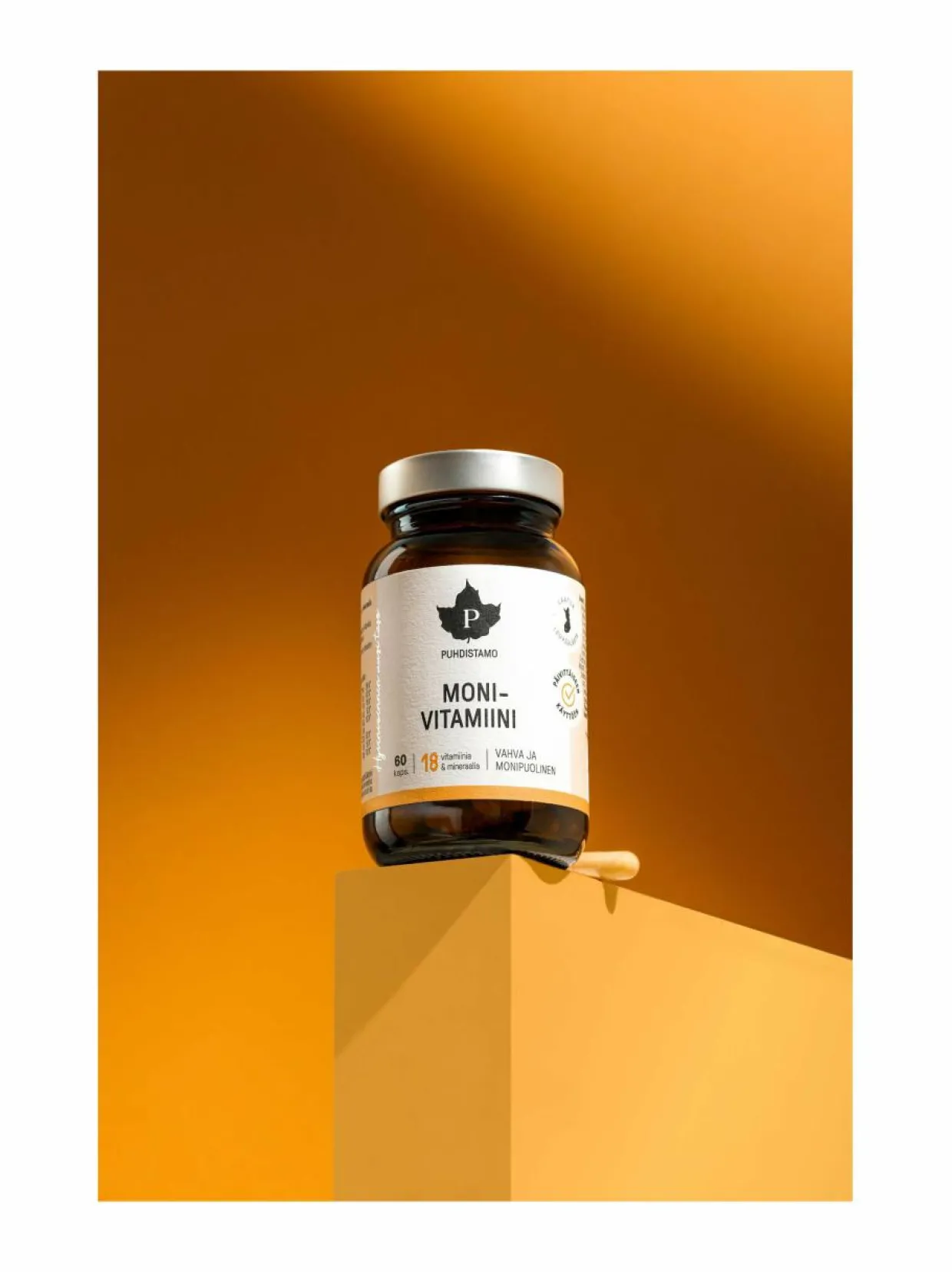 Puhdistamon laadukas monivitamiini yhdistää 18 tärkeää vitamiinia ja mineraalia vahvaksi ja täyteaineettomaksi kokonaisuudeksi.Puhdistamon monivitamiini sisältää optimoidut määrät parhaita vitamiini- ja mineraalimuotoja, jotka tukevat hyvinvointiasi monin tavoin. Kaikki kahdeksan B-vitamiinia ovat mukana, ja niiden joukosta erityisesti B2, B6, B9 (folaatti) ja B12 löytyvät aktiivisissa, elimistölle helpommin hyödynnettävissä muodoissaan. Lisäksi kapselit sisältävät runsaasti C-, D-, E- ja K2-vitamiineja sekä välttämättömiä hivenaineita, kuten jodia ja sinkkiä.