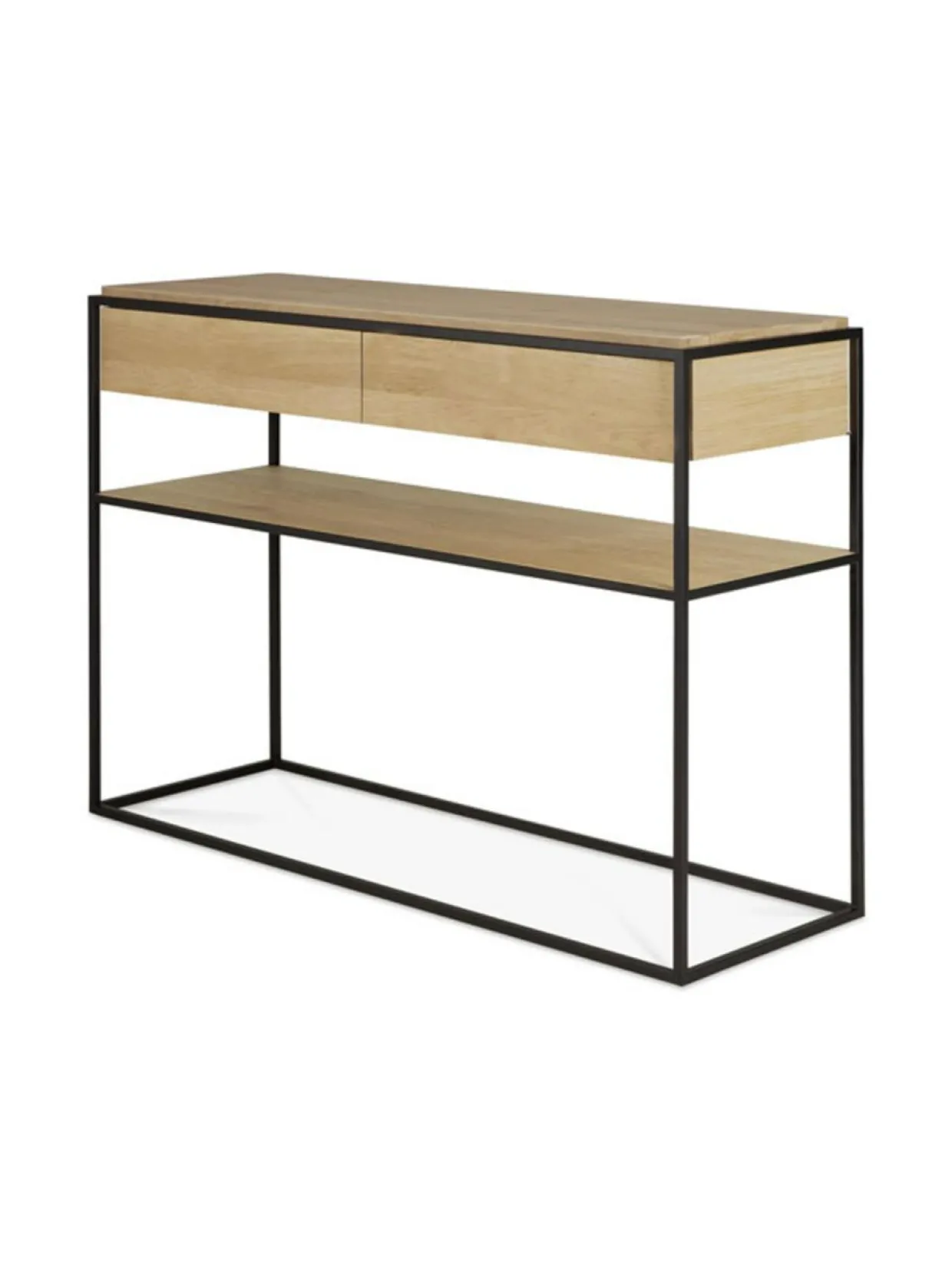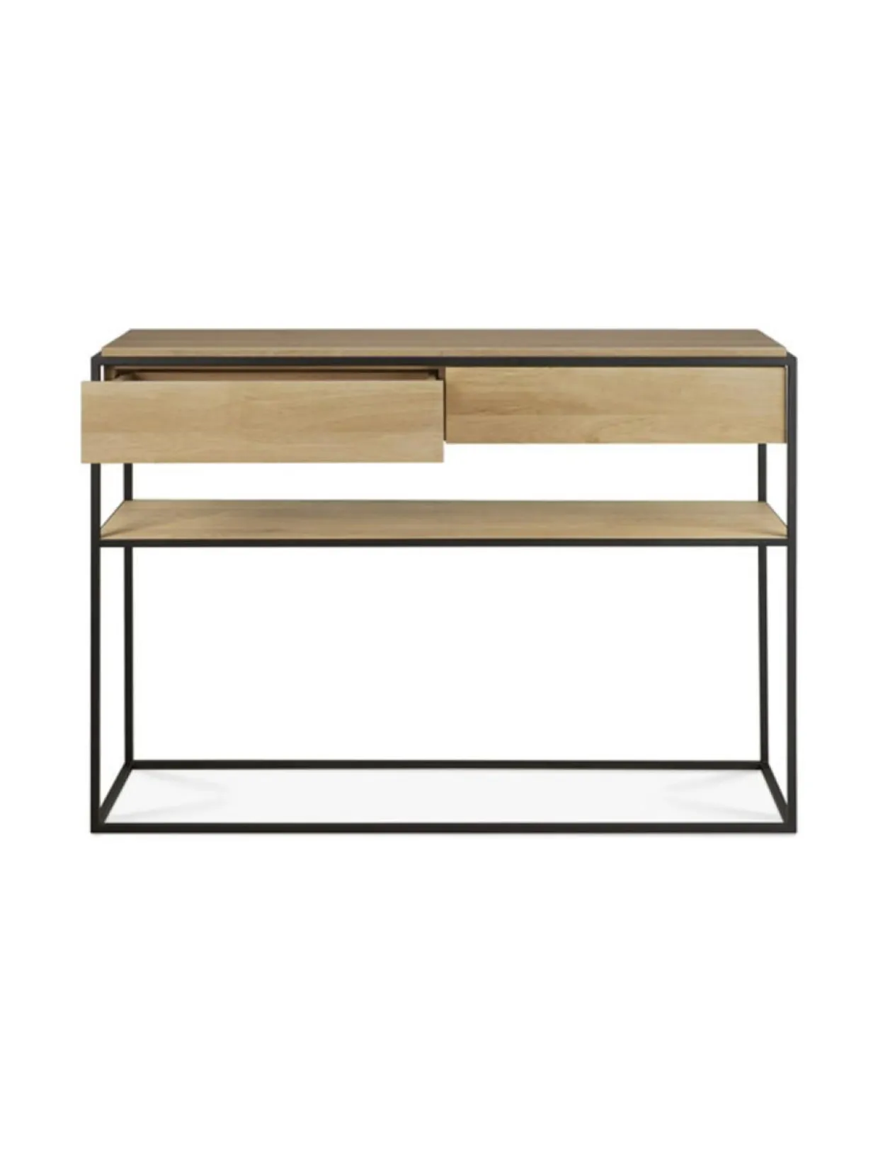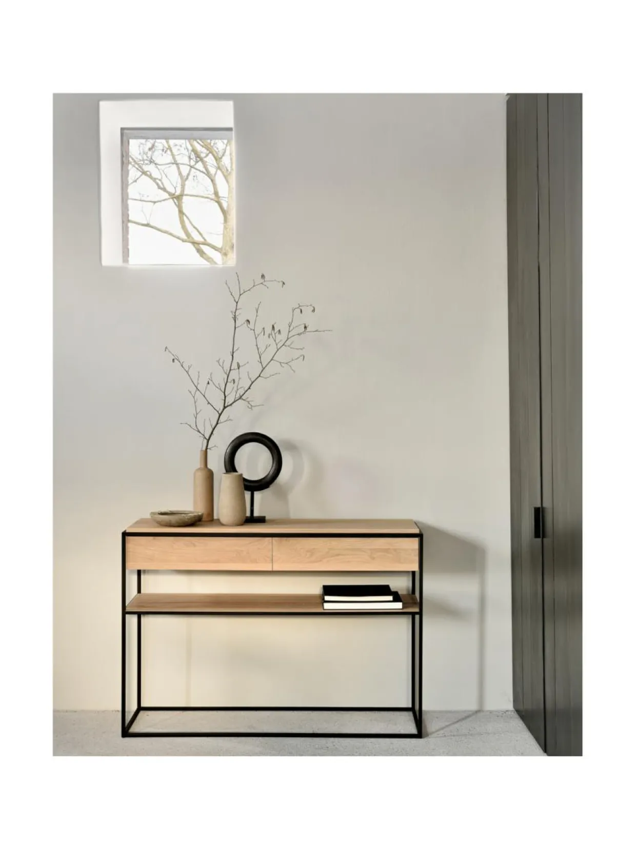 Konsolipöytä Monolit kahdella vetolaatikolla. Puun ja suorakulmaisen metallikehyksen kontrasti luovat ainutlaatuisen yhdistelmän Monolit-tuoteperheessä.