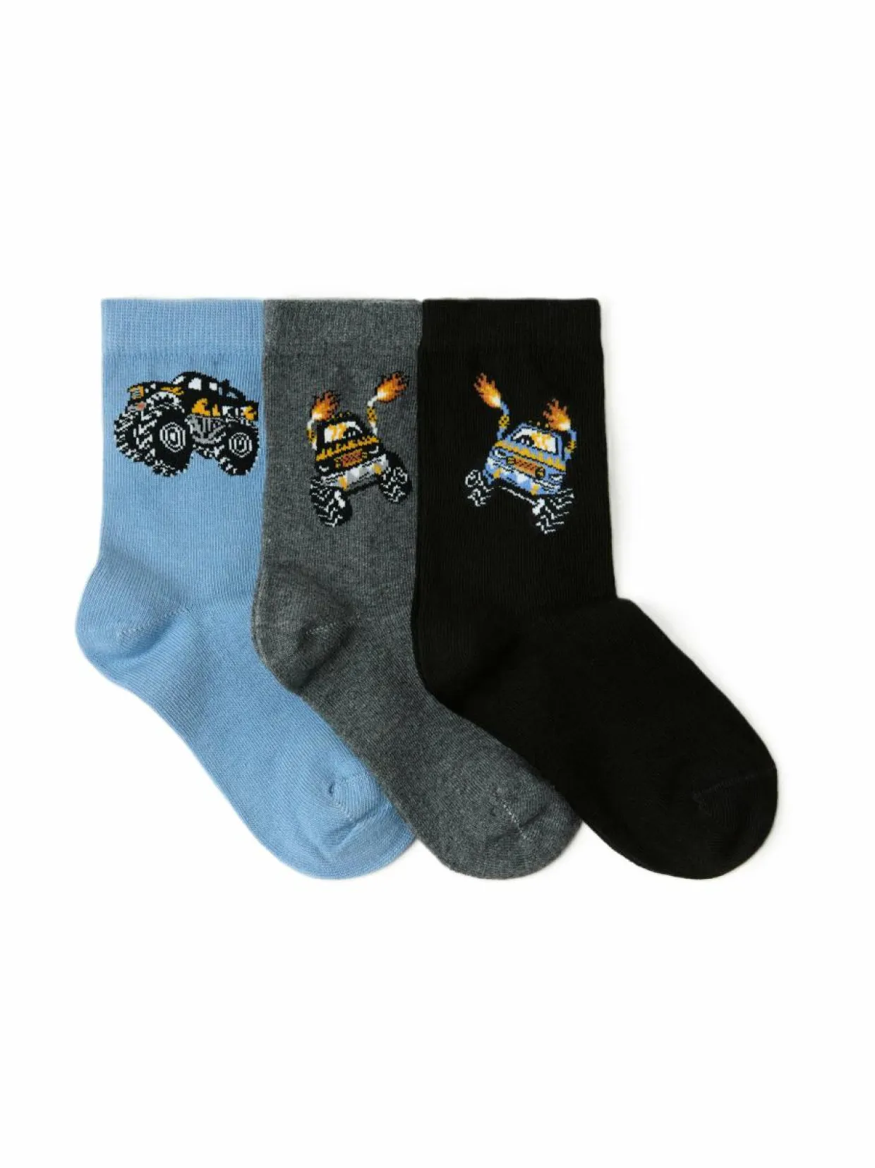 3-pakkaus mukavia lasten puuvillasukkia, joissa on monsteriautokuvioita.