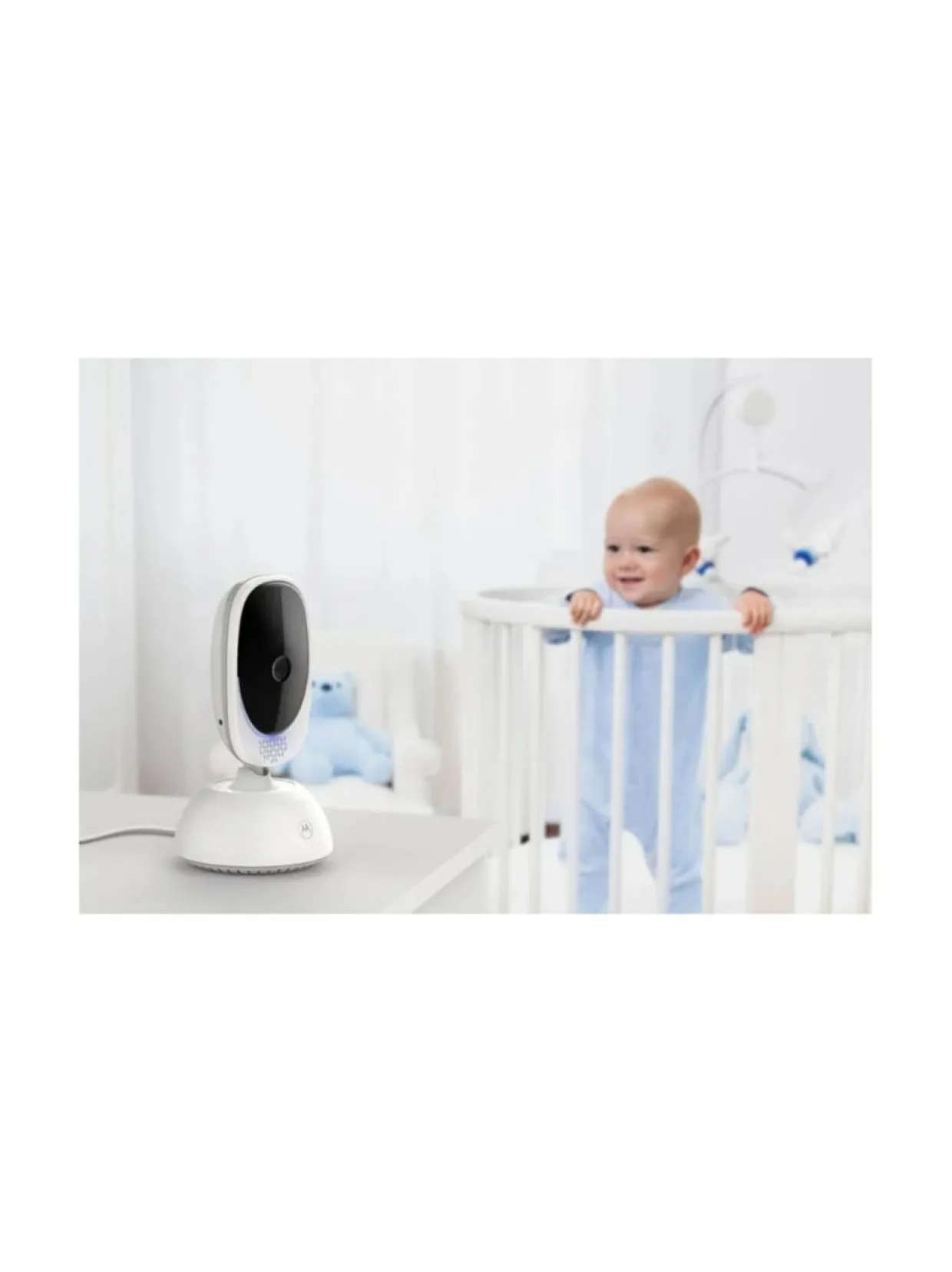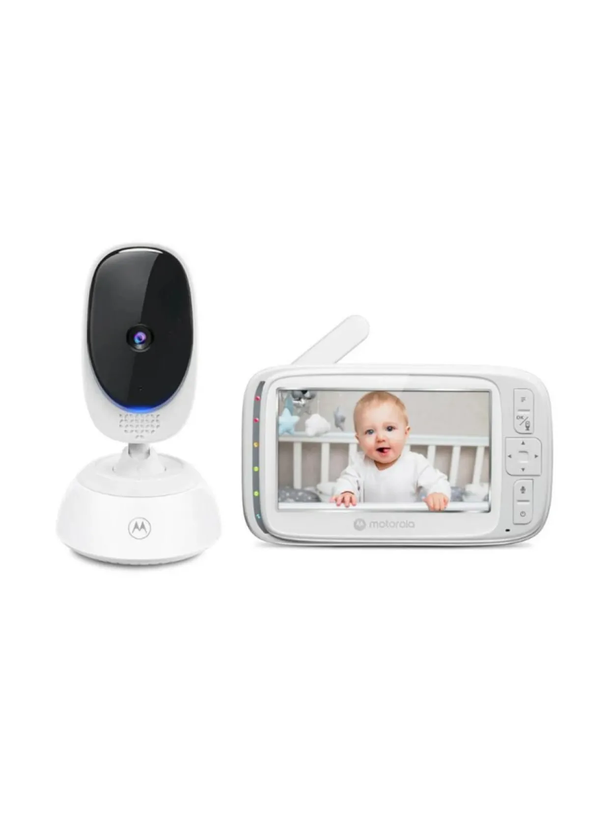 Motorola Babymonitor VM75 Video itkuhälytin on 5 värinäytölllä varustettu kauko-ohjattava videoitkuhälytin, jolla pystyt pitämään asioita silmällä. Kameran kulmaa saa helposti säädettyä kauko-ohjatun panoroinnin, digitaalisen kallistuksen ja zoomauksen avulla. Kaksisuuntainen viestintä tuo mielenrauhaa, ja laitteeseen sisäänrakennetut kehtolaulut auttavat rauhoittamaan lasta. Itkuhälytin on varustettu myös kätevällä infrapunalla toimivalla pimeänäkötoiminnolla, jolla valvonta onnistuu hämärissäkin olosuhteissa.Itkuhälyttimessä on 300 metrin kantama, jonka ansiosta voit liikkua kotona vapaasti ja samalla valvoa vauvaa. Laite ilmoittaa, mikäli liikutaan kantoalueen ulkopuolelle. Itkuhälyttimessä on ulkoinen tarkennus, sekä lämpöptilamittaus, joka näyttää lämpötilan vauvan huoneessa. Langaton 2,4 GHz FHSS-teknologia varmistaa turvallisen signaalin ja yksityisyyden.Pakkauksen sisältö: