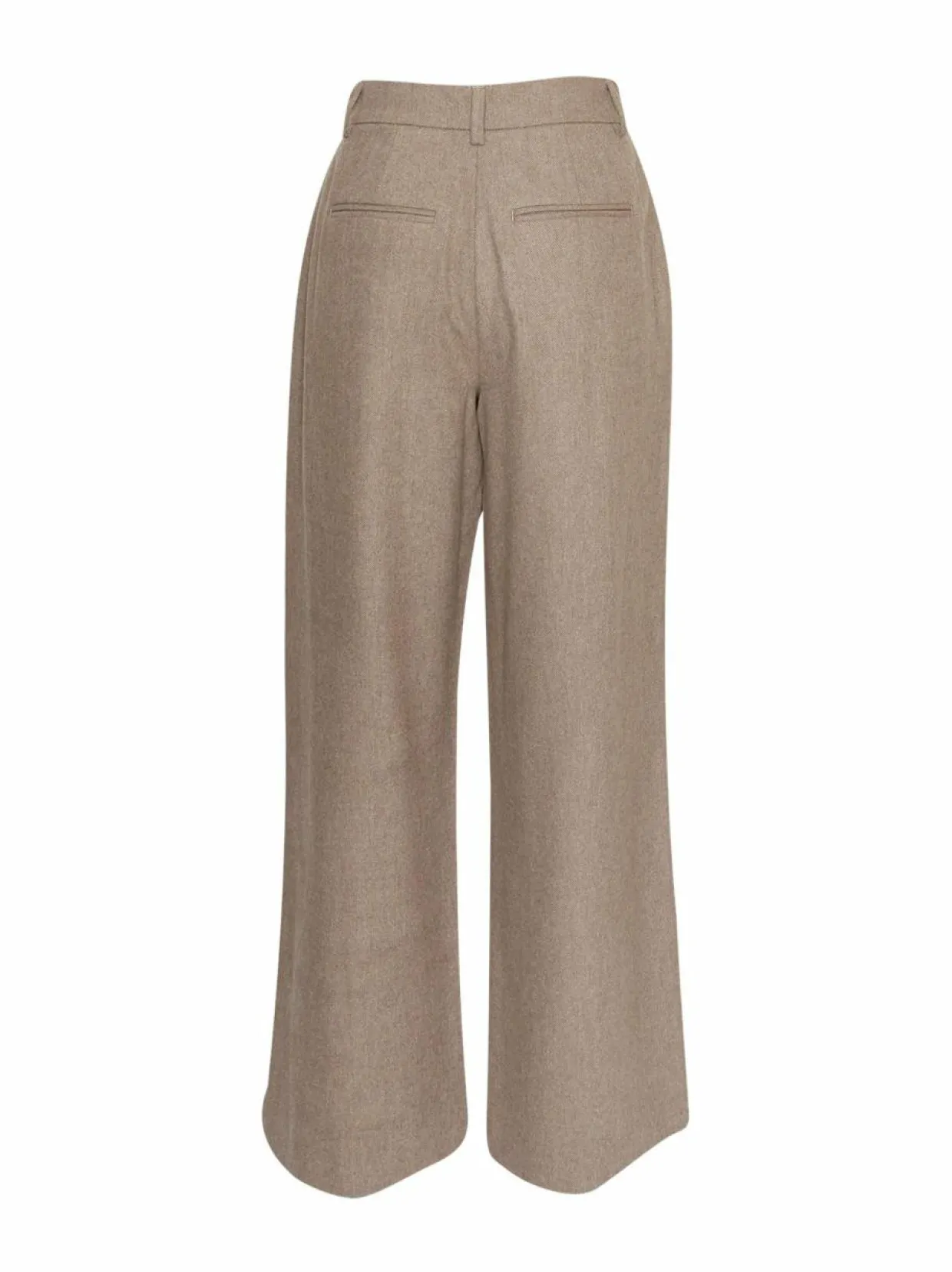 MSCH Copenhagen MSCHJennabella-housut ovat täydellinen valinta talven viileisiin päiviin. Näissä korkeavyötäröisissä, leveälahkeisissa puvunhousuissa on laskokset, taskut sekä vetoketju- ja nappikiinnitys, mikä tuo niihin klassista ilmettä ja toimivuutta. Housut on valmistettu miellyttävästä villasekoitteesta, joka tarjoaa lisälämpöä ja mukavuutta kylmiin kuukausiin. Viskoosi tuo kankaan pintaan miellyttävää sileyttä ja joustoa, kun taas polyesteri lisää materiaalin kestävyyttä. Lämmin sävy viimeistelee tyylin, tuoden asuusi pehmeyttä ja hienostuneisuutta.