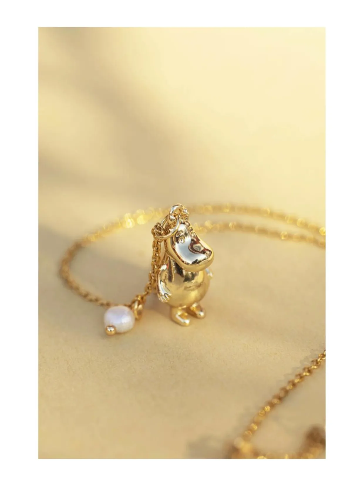 18k kullattu lasten kaulakoru, jossa edessä valkoinen aito makeanveden helmi ja valettu kullattu Muumi-koru keskellä. Kaulakorussa on säädettävä pituus 38-42 cm. Muumihahmo on 21 mm korkea. Nikkeliturvallinen.