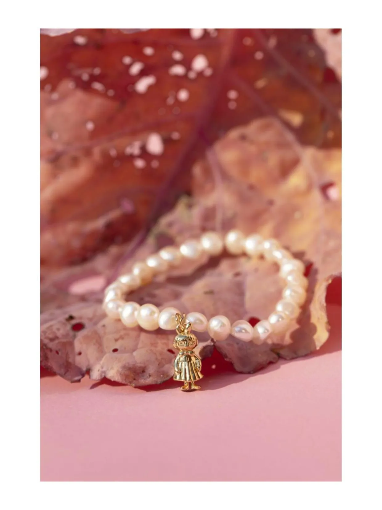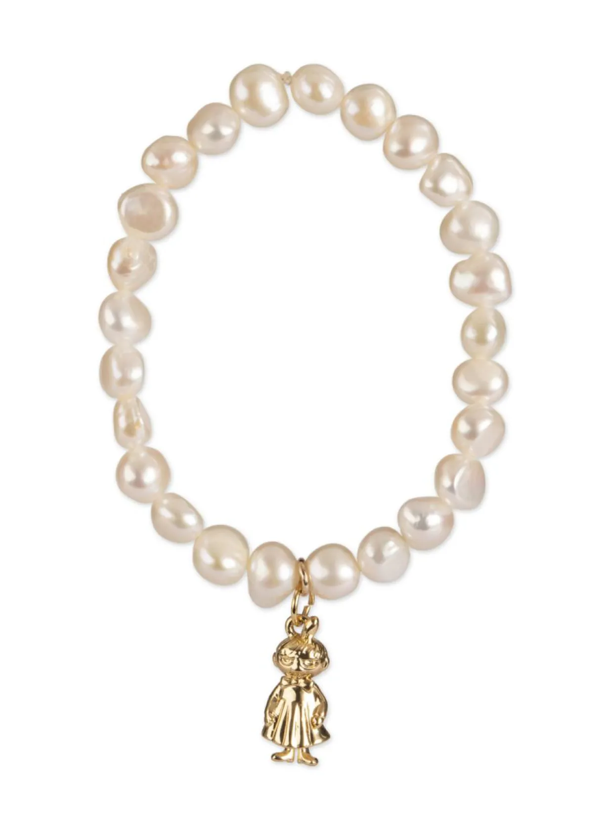 Joustava lasten rannekoru, jossa aitoja valkoisia makeanveden helmiä ja valettu 18k kullattu Little My charmi, joka roikkuu keskellä edessä. Rannekorun ympärysmitta on 15 cm. Korut ovat 17 mm korkeat. Nikkeliturvallinen.
