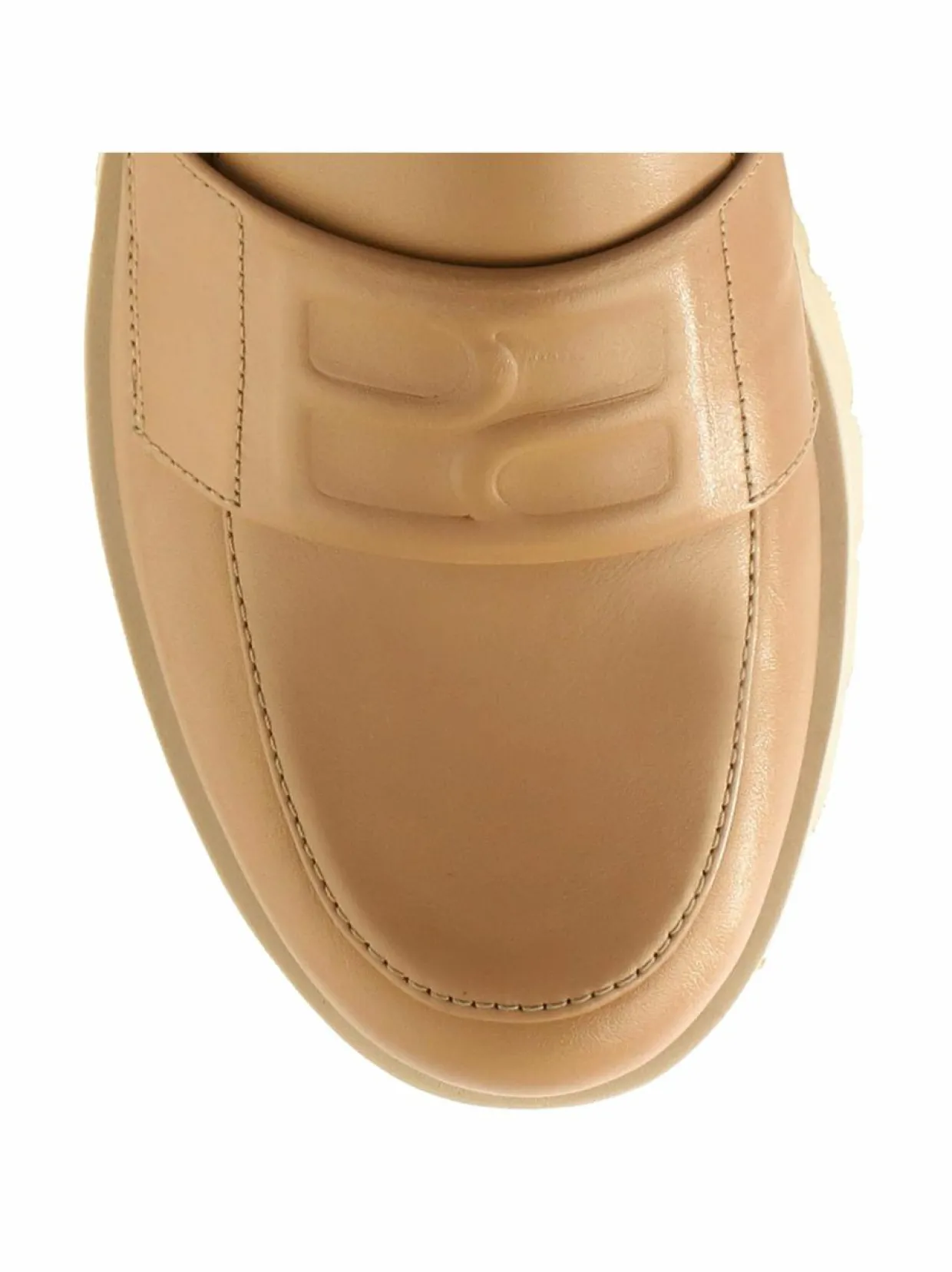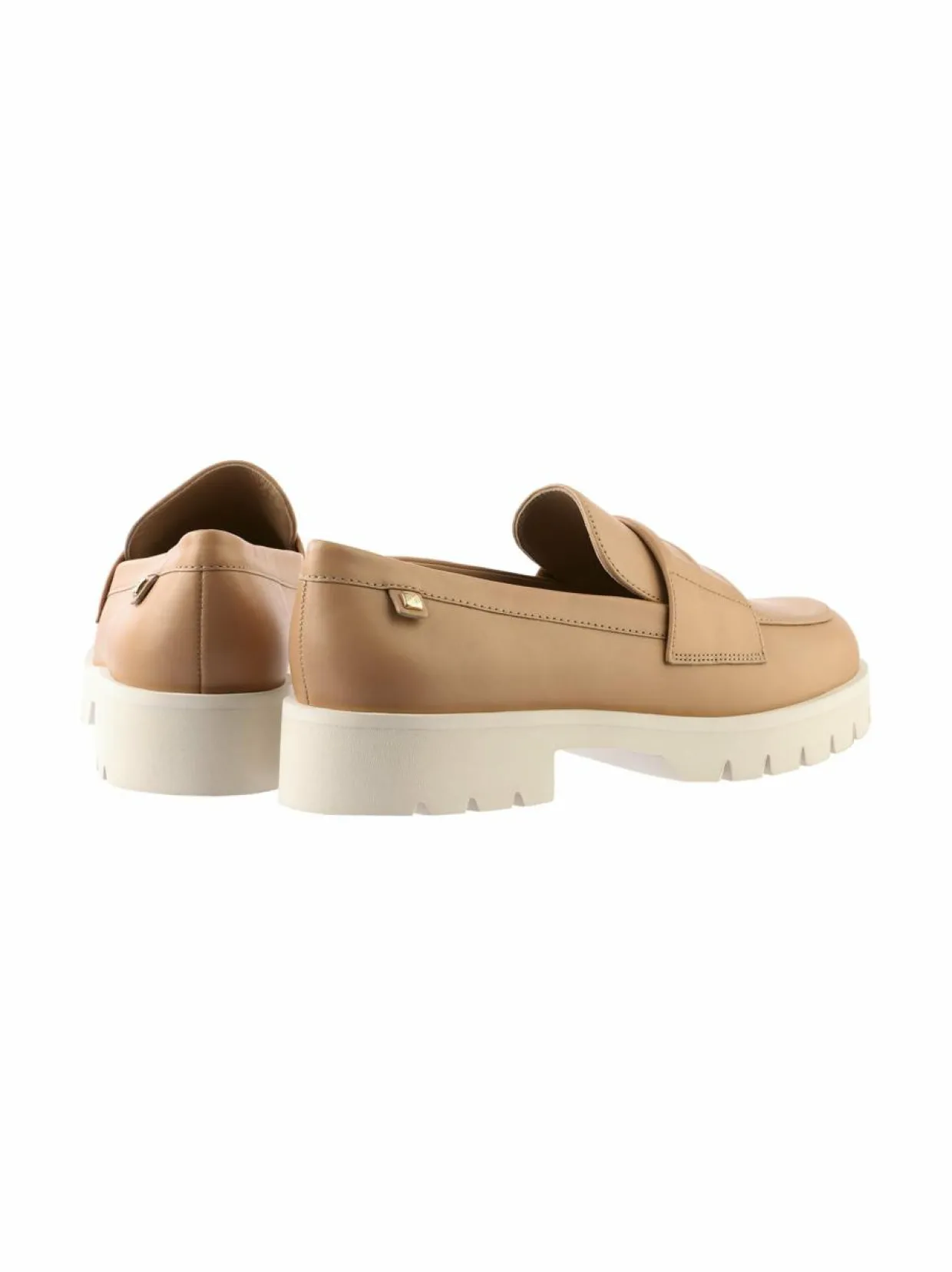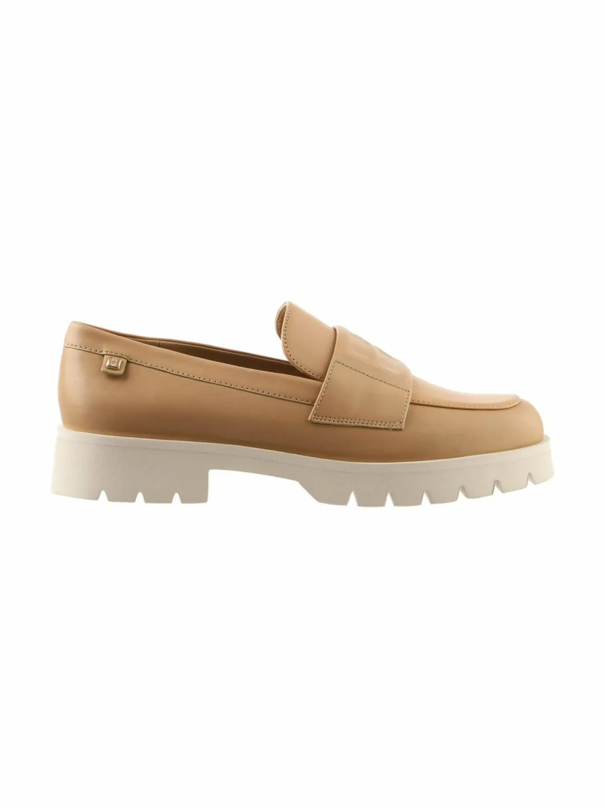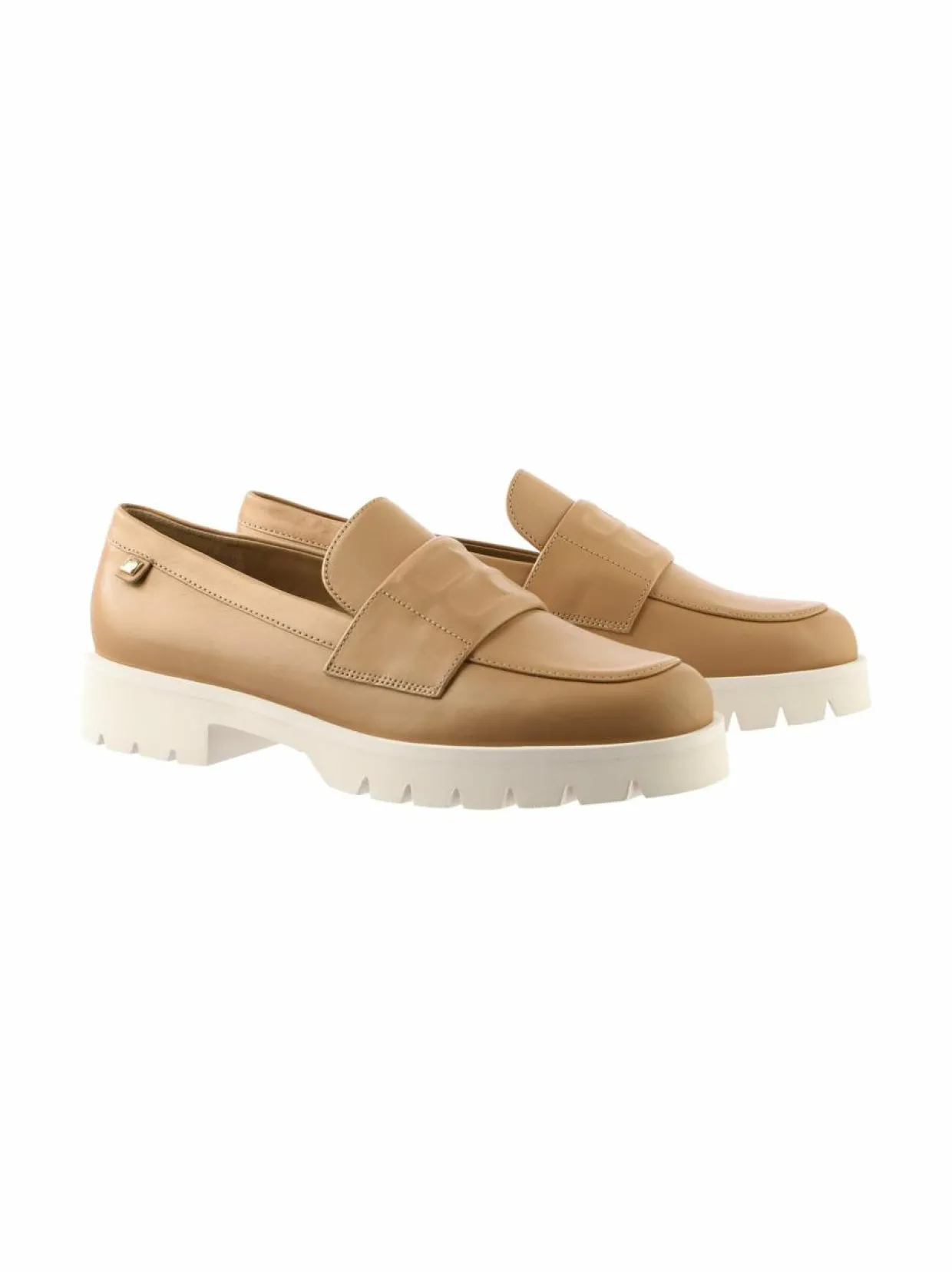 Moderni, mattanahkainen loaferpari Högliltä. Kengissä on rouheva, uurteinen ulkopohja. Sekä sisäpuoli että päällinen ovat nahkaa. Päällistä koristavat kohokuviologot. Kengät ovat helposti jalkaan sujautettavat ja riisuttavat.