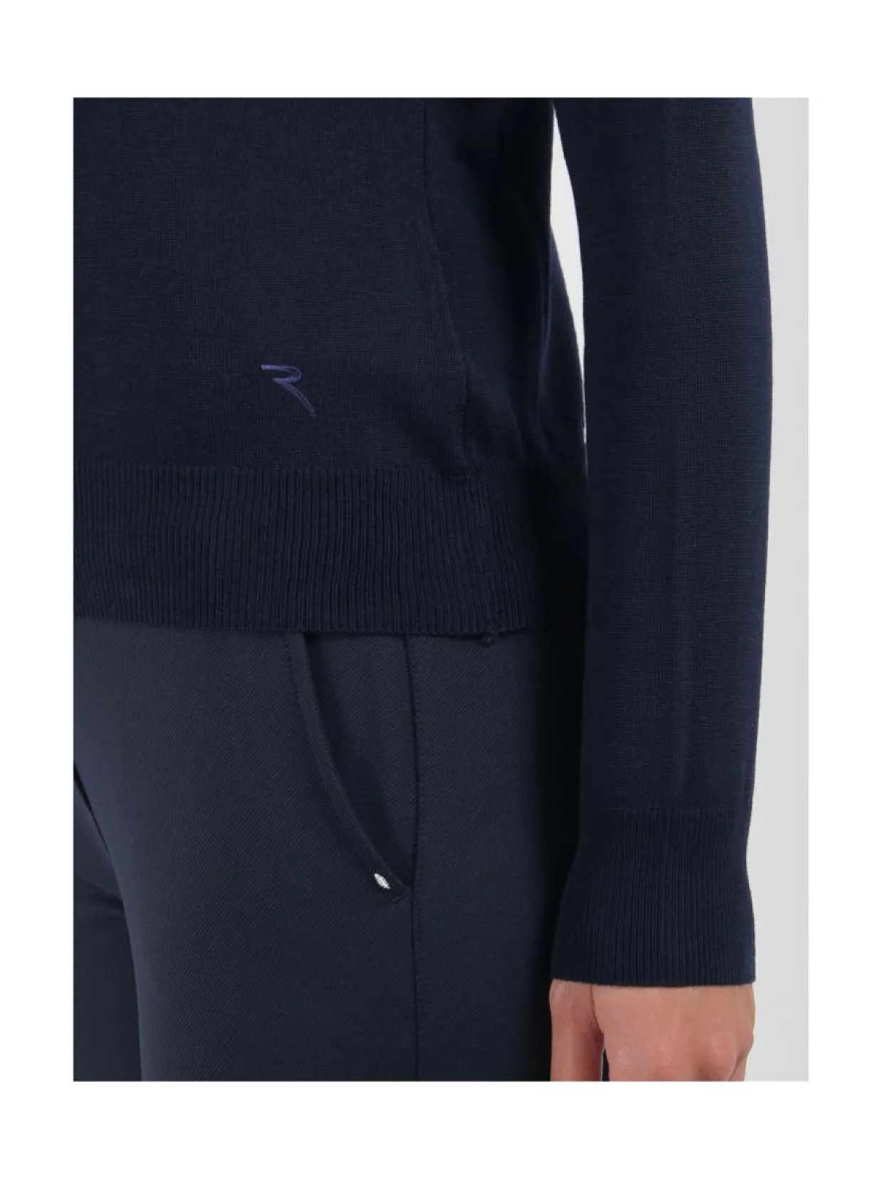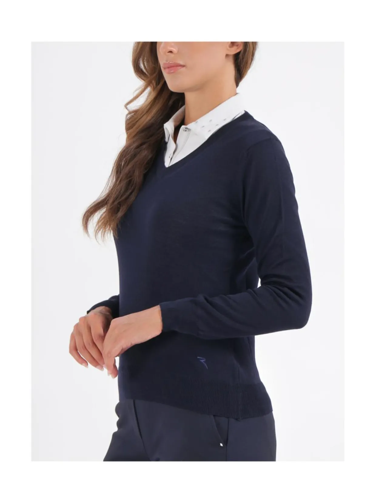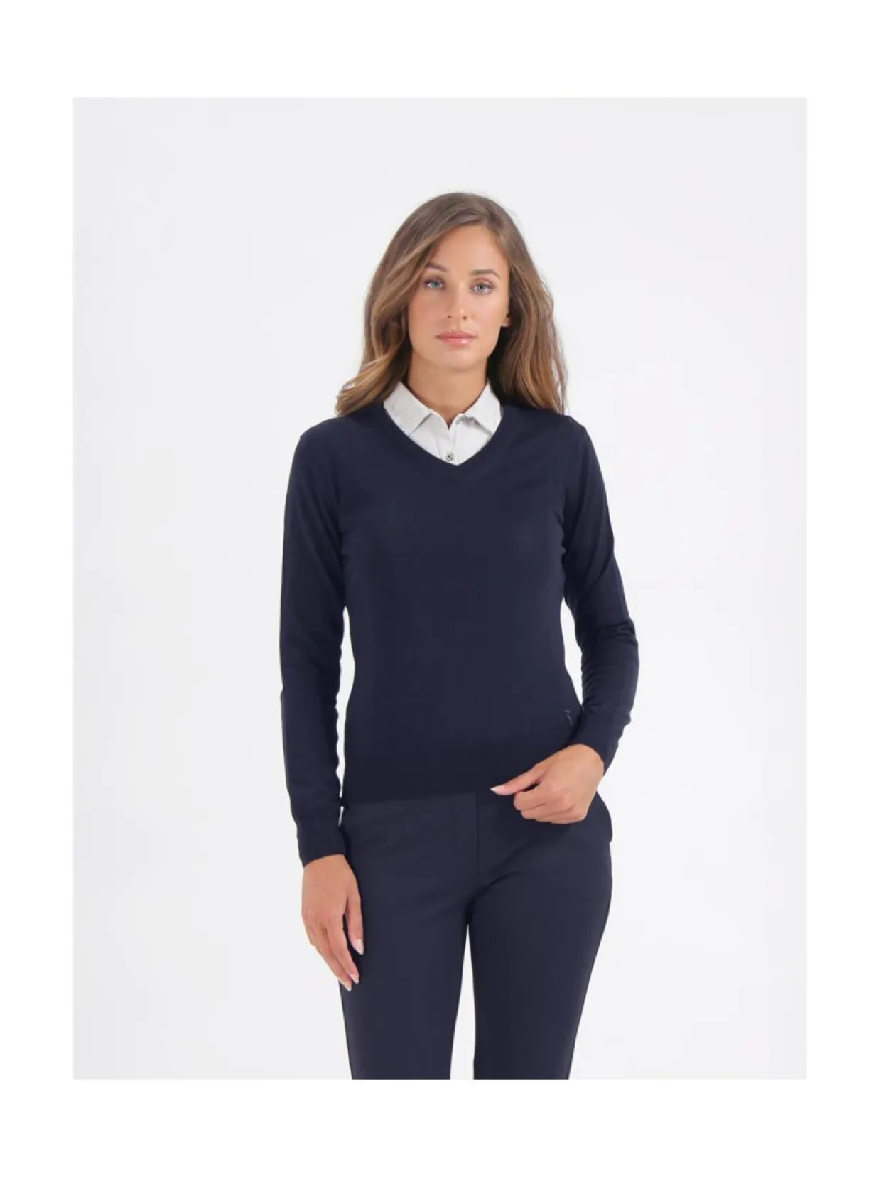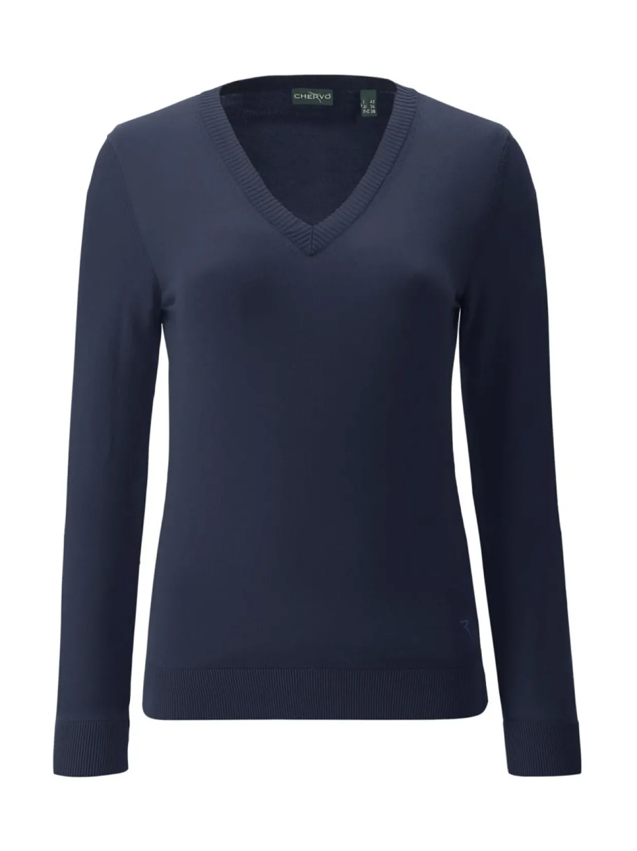 Klassinen Chervò naisten merinovillasta valmistettu tummansininen neule sopii hyvin moniin erilaisiin asukokonaisuuksiin. Neuleessa on V-muotoinen pääntie sekä resorit pääntiellä, hihoissa ja helmassa. Neuleen helmassa vasemmalla puolella on myös Chervòn pieni sininen logo. Tummansininen neule on miellyttävän ohut ja tuntuu mukavalta päällä. Tämä neule sopii erittäin hyvin niin golfin pelaamiseen kuin arkikäyttöön.