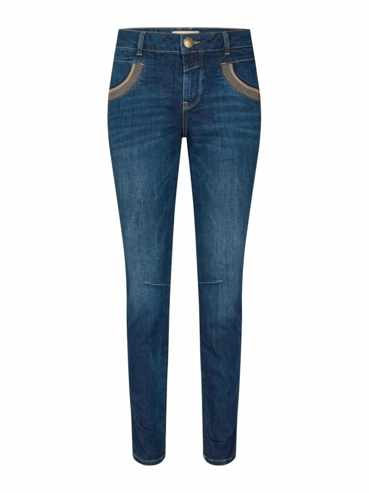 Matalavyötäröiset farkut skinny-istuvuudella. Sivutaskujen reunat on koristeltu brodeerauksin.