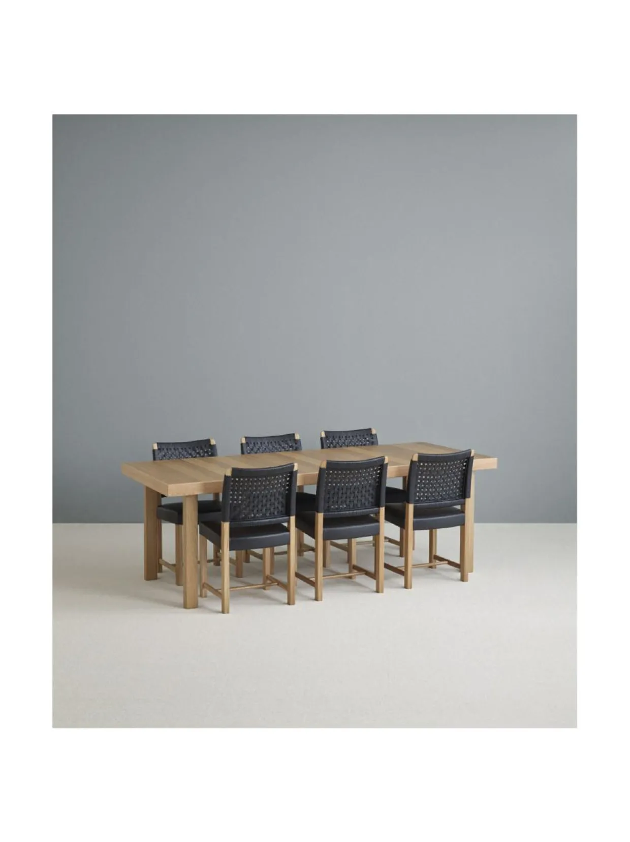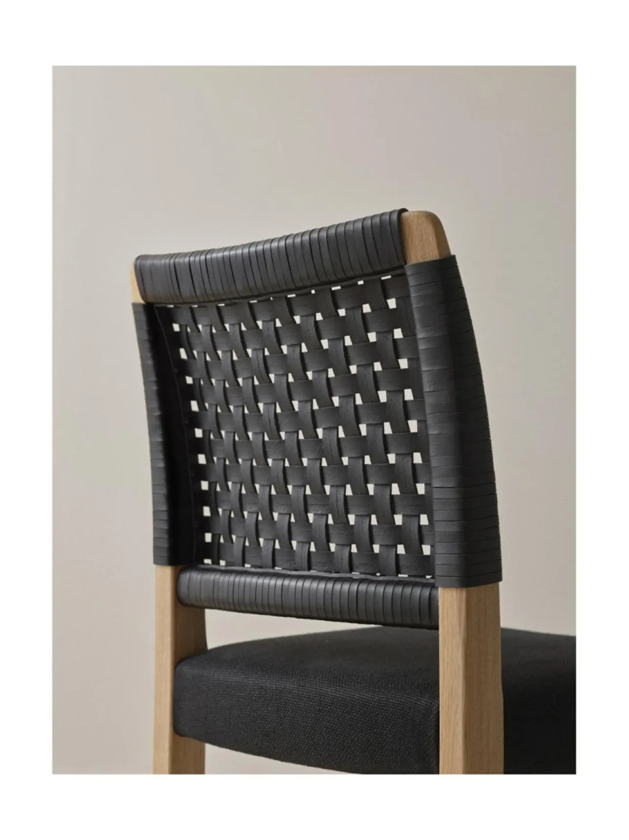 Näyttely-tuolin käsin punottu selkänoja antaa tuolille hienostuneen ilmeen. Samalla se toimii visuaalisena vastavetona tuolin minimalistisille linjoille.